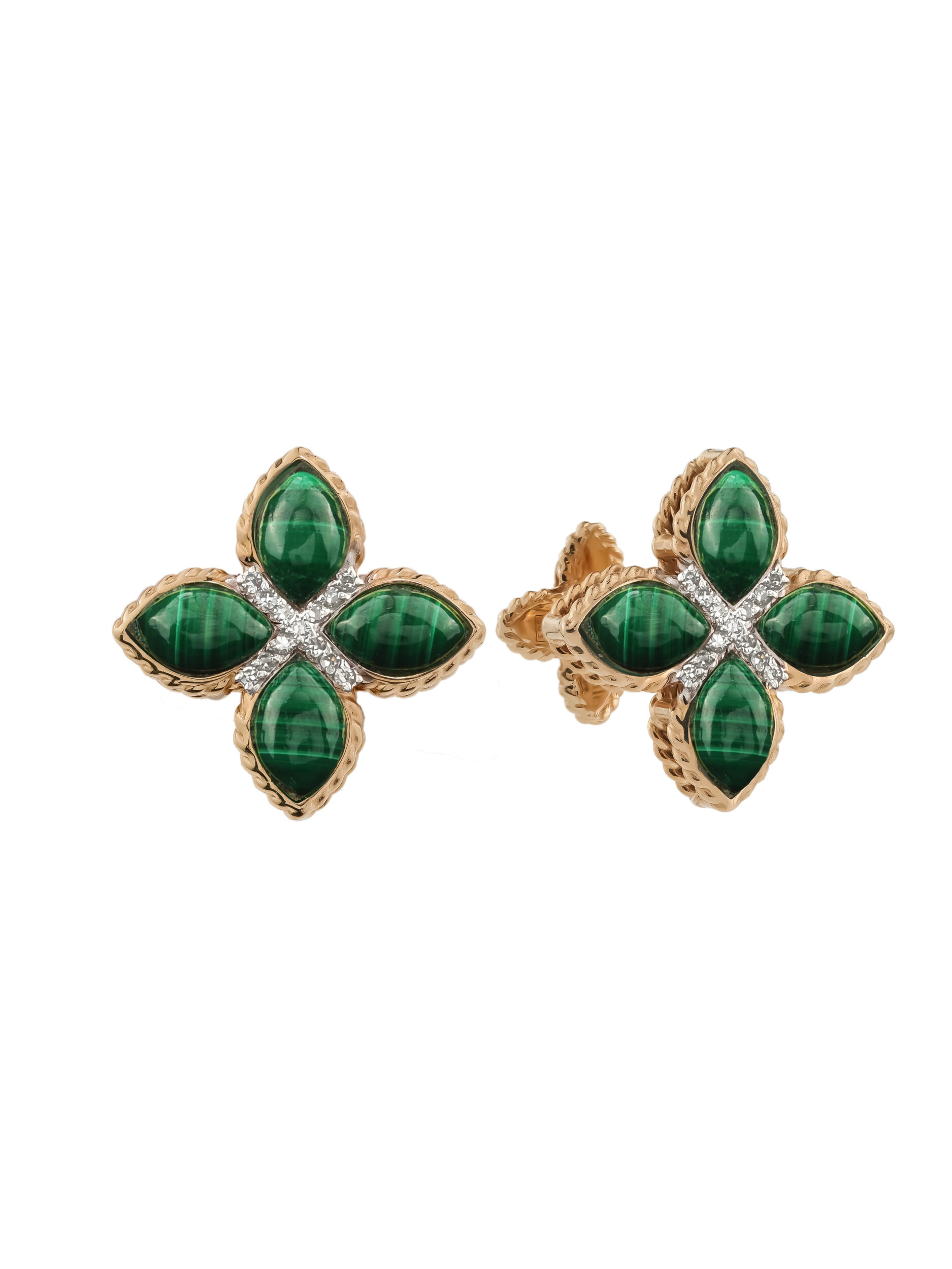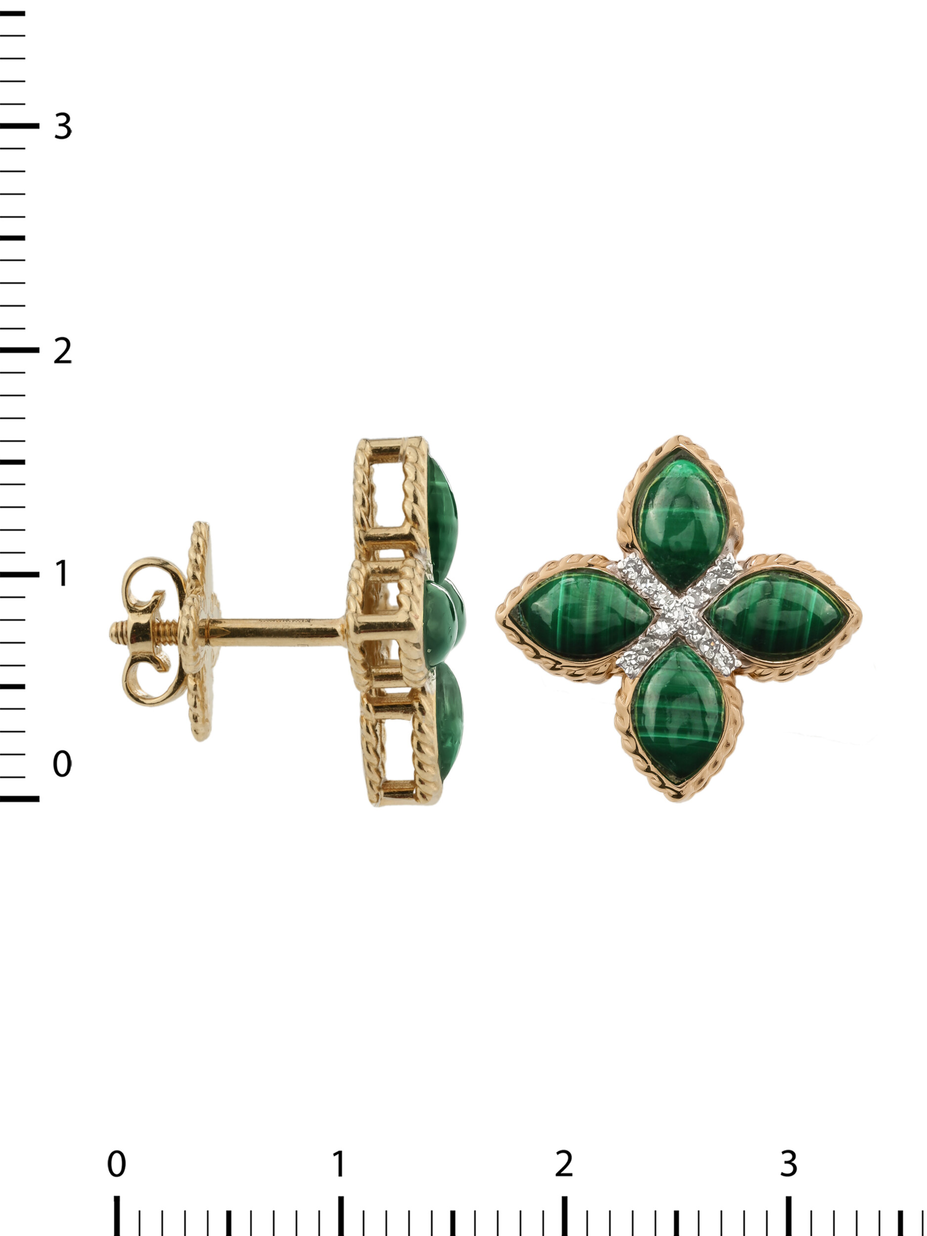 Элегантные серьги из красного золота 585 пробы представляют собой воплощение изысканного стиля и благородства. Данное украшение, вошедшее в коллекцию De Luxe — Венецианская принцесса, привлекает внимание своим утонченным дизайном в форме клевера, который гармонично сочетает в себе классические традиции и современные ювелирные тренды. Центральным элементом композиции стали вставки из натурального малахита глубокого зеленого цвета, ограненные в форме нежного лепестка. Их насыщенный природный узор великолепно оттеняется ярким блеском 26 вставок из белых бриллиантов круглой формы, расположенных в самом сердце композиции.