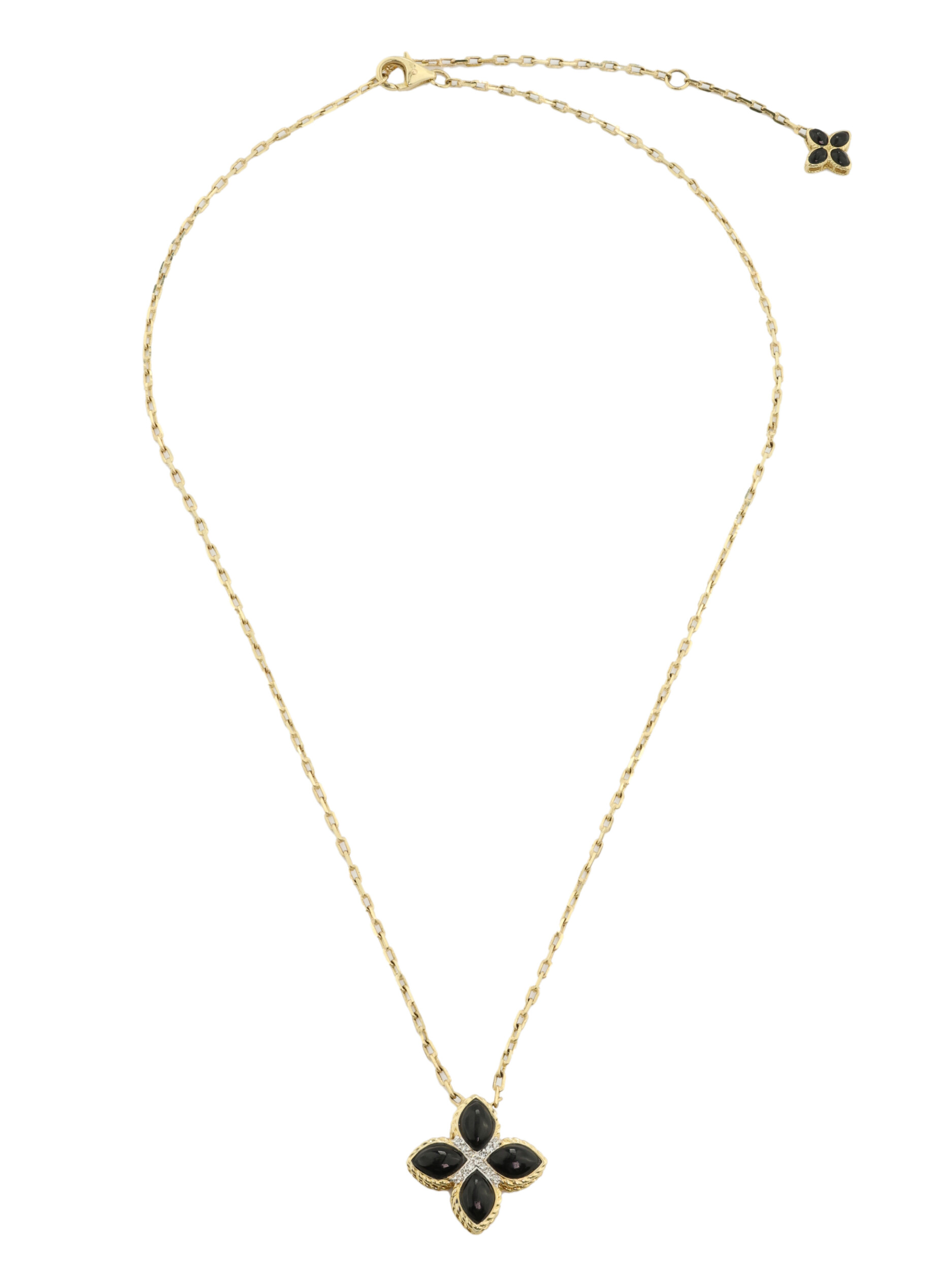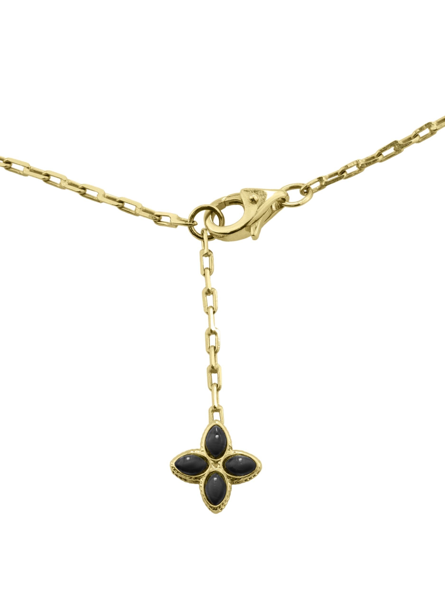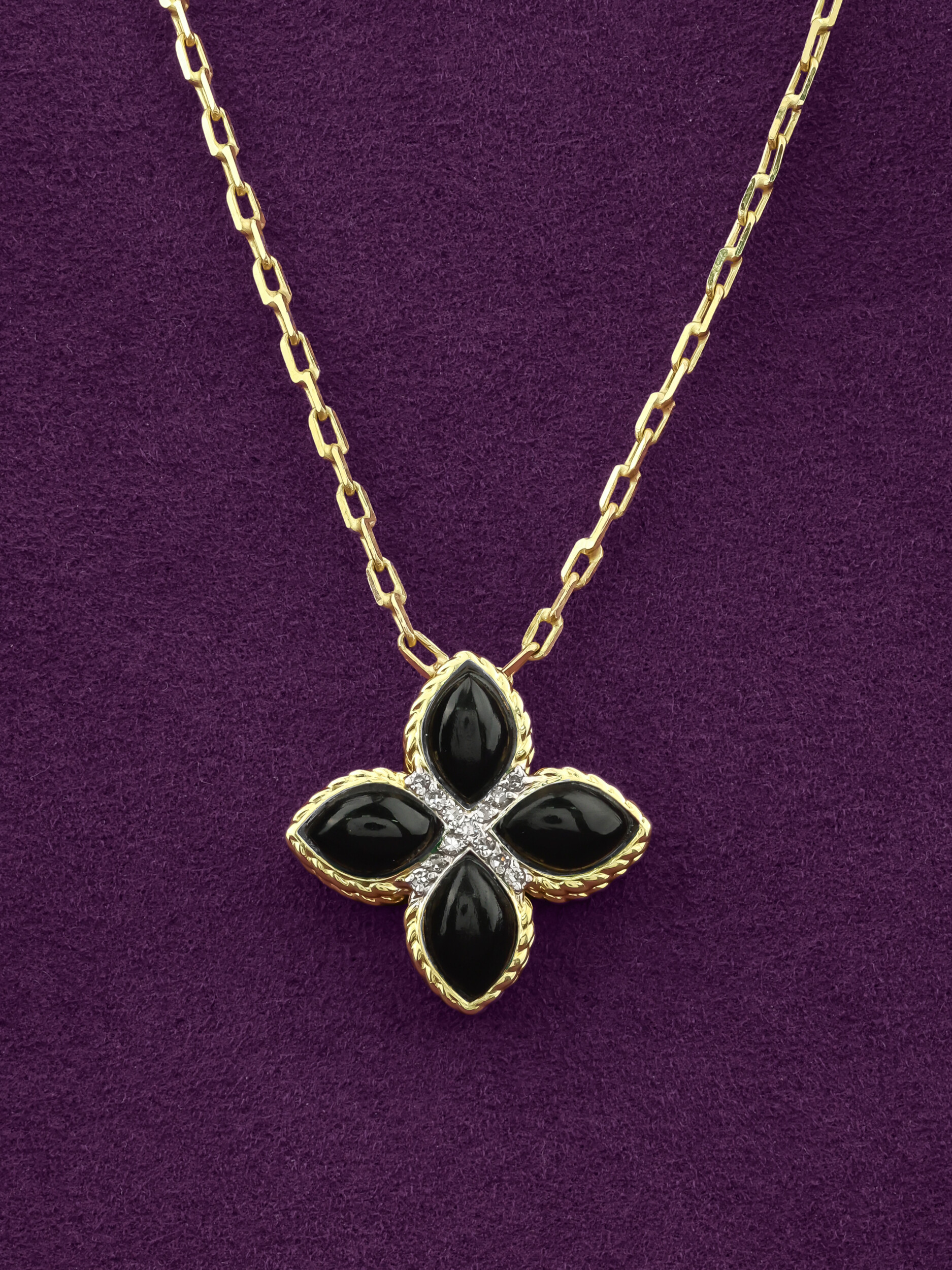 Изысканное колье из лимонного золота 585 пробы из коллекции De Luxe — Венецианская принцесса станет безупречным акцентом вашего образа. Это ювелирное изделие воплощает в себе гармонию контрастов и утонченный стиль. Центральным элементом украшения выступает выразительный дизайн в форме клевера, который притягивает взгляд и подчеркивает статусность владельца. Глубокий черный цвет оникса в форме лепестка идеально сочетается с теплым сиянием лимонного металла, создавая композицию, полную благородства и загадочности.