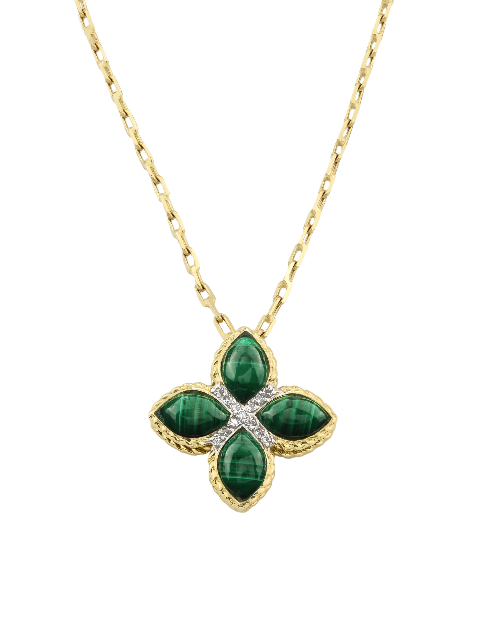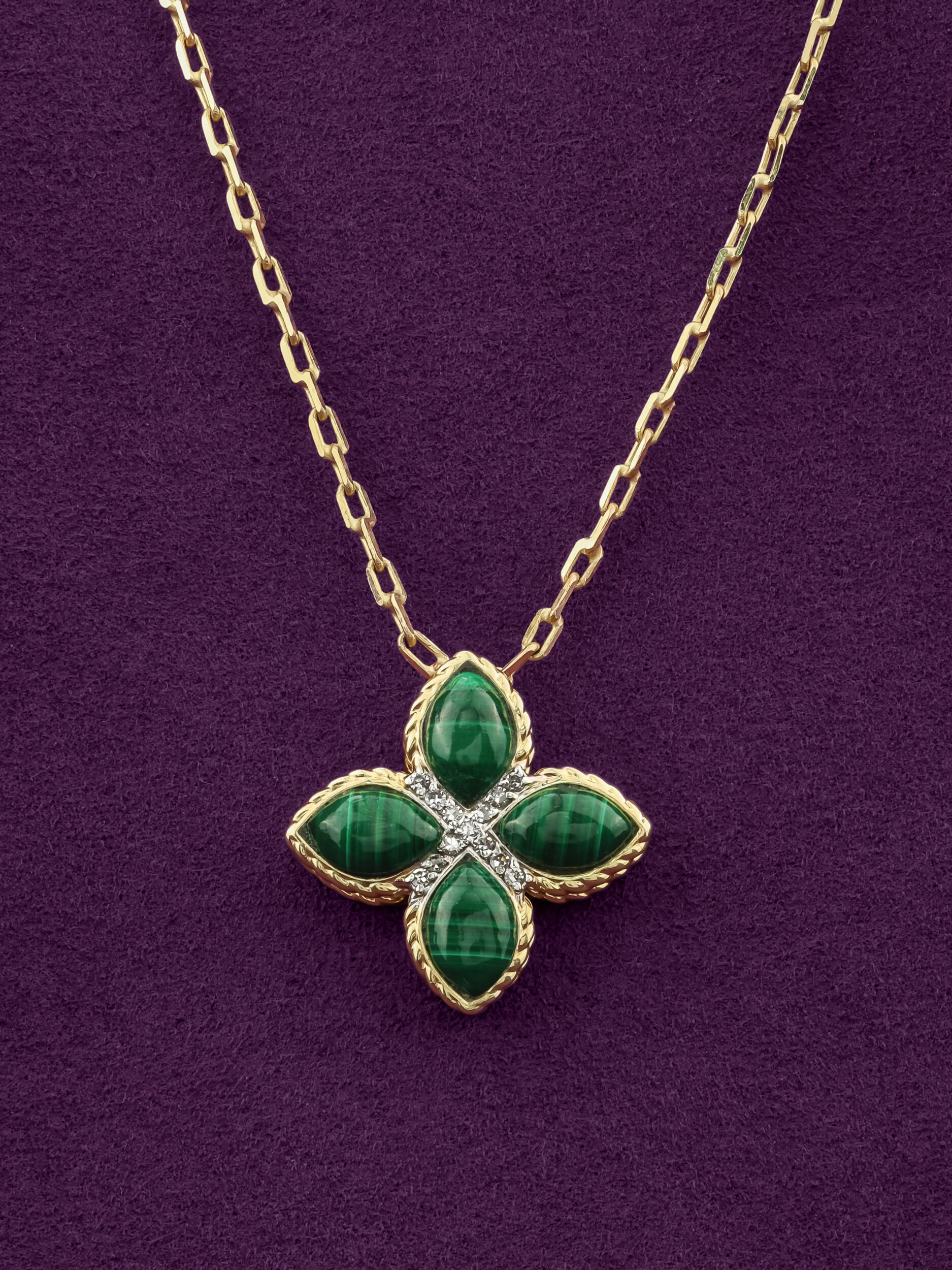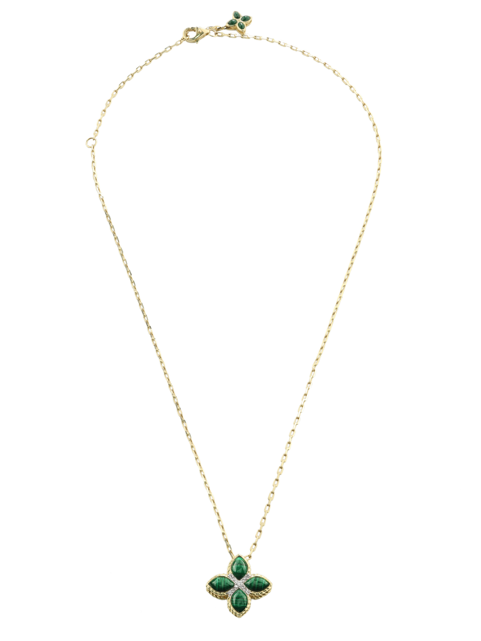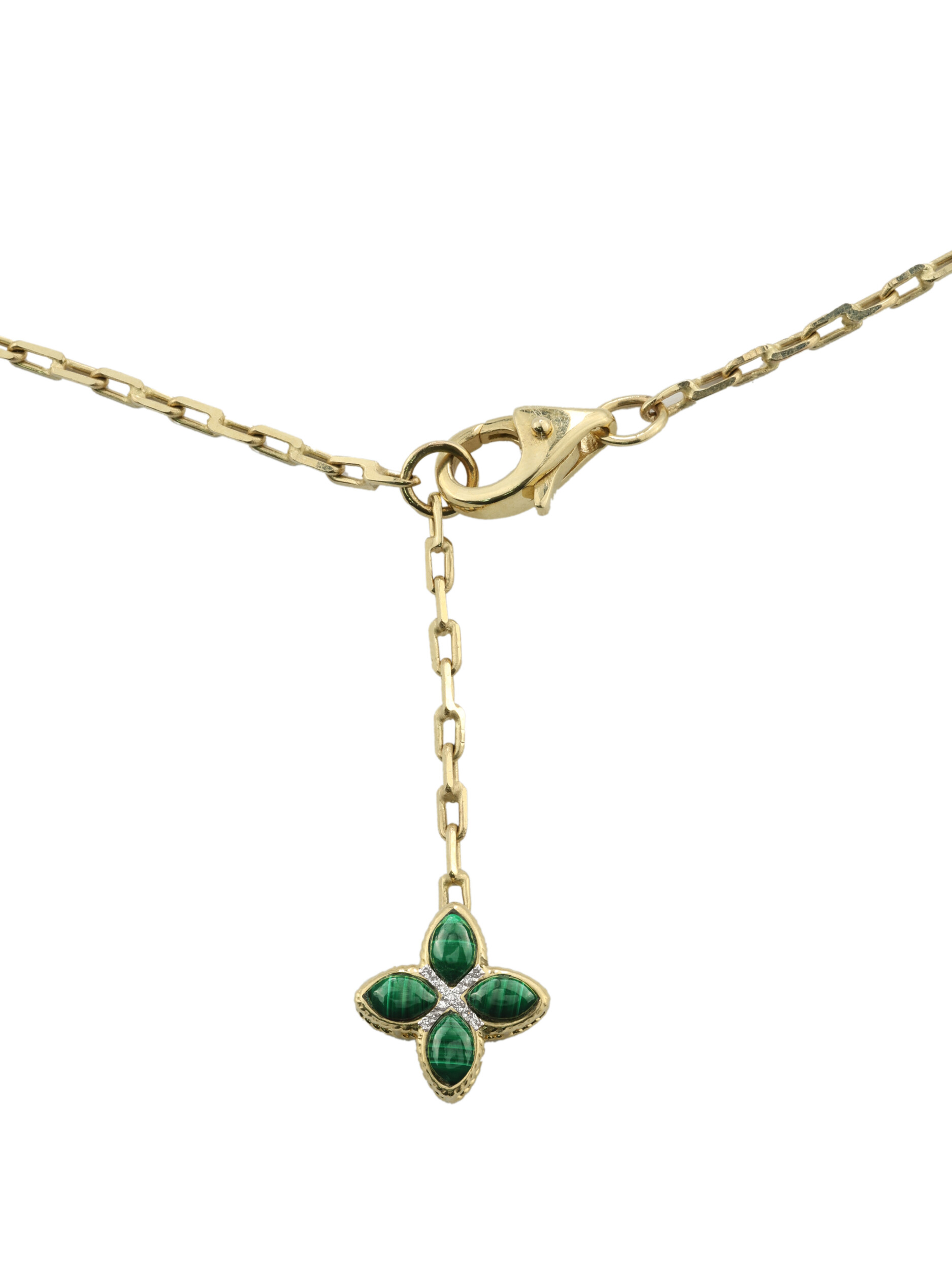 В центре внимания — глубокий зелёный цвет малахита с характерным природным рисунком. Четыре вставки формы лепесток великолепно дополнены сверкающими вставками в форме круг: всего в украшении использована 21 вставка, включающая бриллианты и малахит. Сочетание белого блеска драгоценных камней и насыщенных зелёных оттенков камня на фоне тёплого лимонного золота делает это колье по-настоящему статусным аксессуаром.