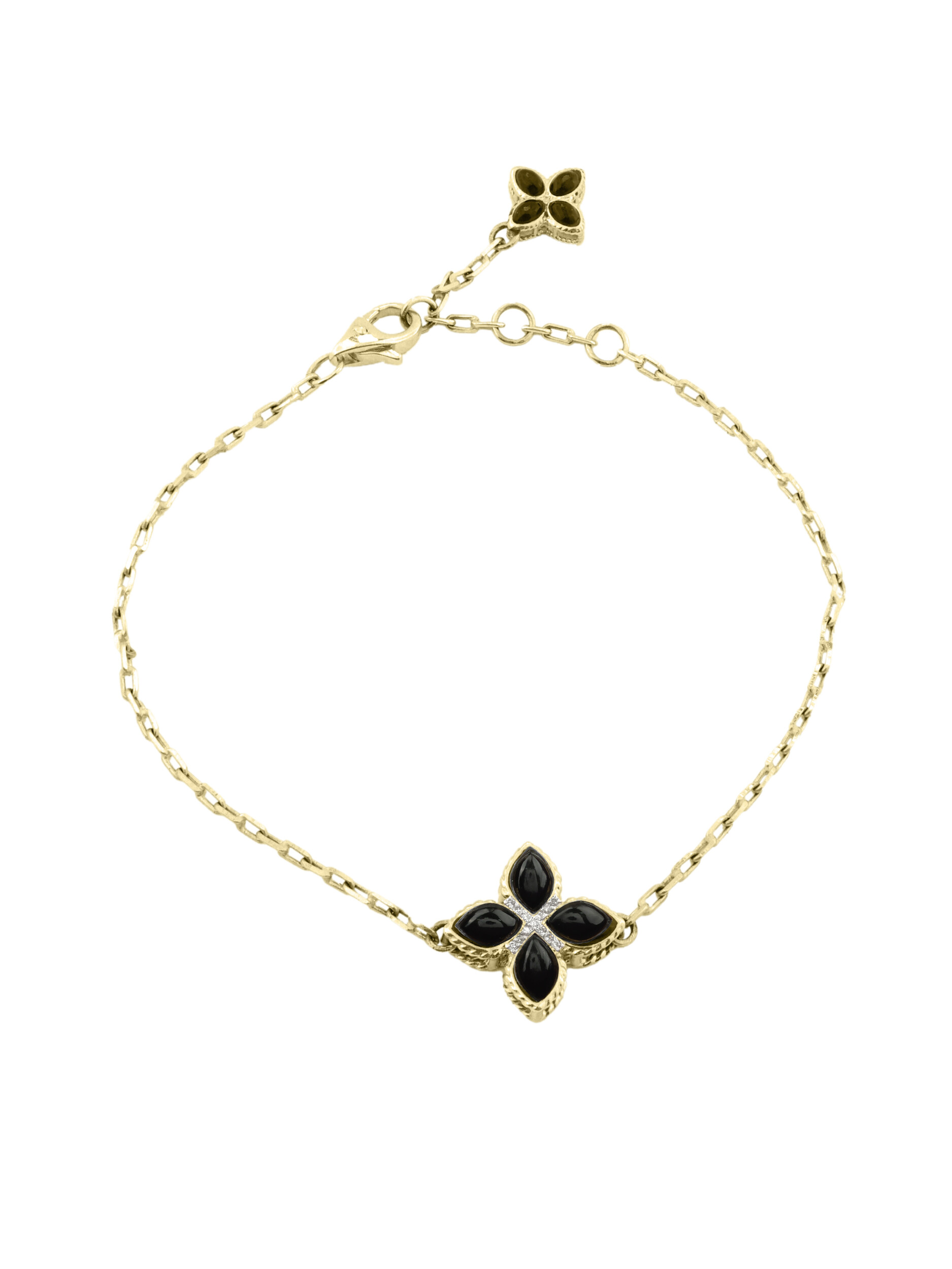Элегантный браслет из лимонного золота 585 пробы из коллекции De Luxe — Венецианская принцесса станет безупречным акцентом вашего образа. Дизайн украшения воплощает классическую эстетику в современном прочтении: центральный элемент выполнен в форме изящного клевера, символизирующего удачу и гармонию. Основу композиции составляют 17 вставок, среди которых глубокий черный оникс и искрящиеся бриллианты.