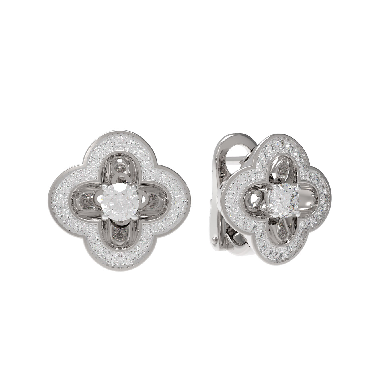 Основой изделия служит качественное белое золото 585 пробы, которое подчеркивает холодное сияние вставок. Главным акцентом стали 58 бриллиантов, которые притягивают взгляд своим ослепительным блеском. Белый цвет вставок гармонично сочетается с общим оформлением серег. Камни классической круглой формы огранки мастерски закреплены, создавая единую композицию, которая переливается при каждом движении.