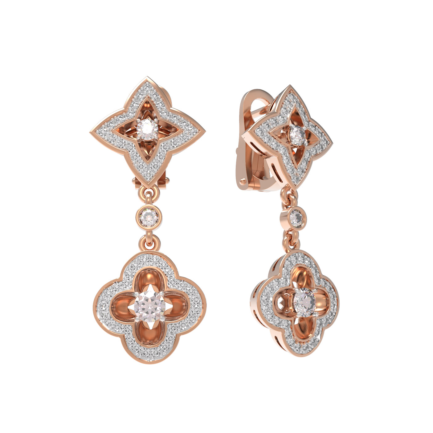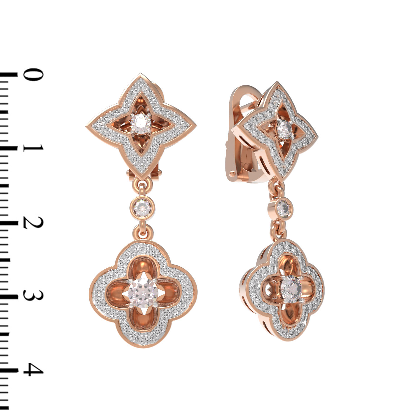 Центральным элементом декора выступают 110 бриллиантов, которые создают завораживающую игру света при каждом движении. Кристально чистые вставки круглой формы белого цвета великолепно контрастируют с теплым оттенком красного золота, создавая яркий и запоминающийся акцент. Изящная структура серег позволяет им стать идеальным дополнением как к вечернему образу, так и к повседневному деловому костюму.
