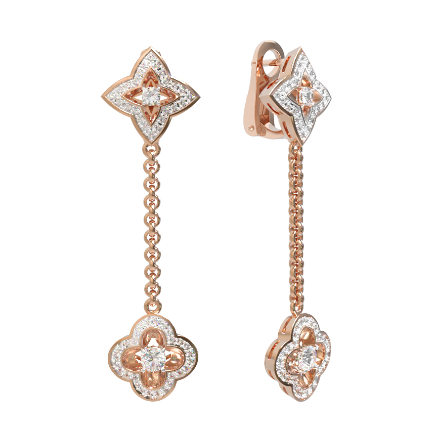 Серьги из красного золота 585 пробы из коллекции De Luxe — Верона представляют собой воплощение изысканности и утонченного стиля. Эти ювелирные изделия привлекают внимание своим оригинальным дизайном в форме цветов, создавая гармоничный и притягательный образ. Конструкция серег отличается выразительностью: центральные элементы эффектно соединены подвижной цепочкой, что придает украшению динамичность и особую грацию при каждом движении.
