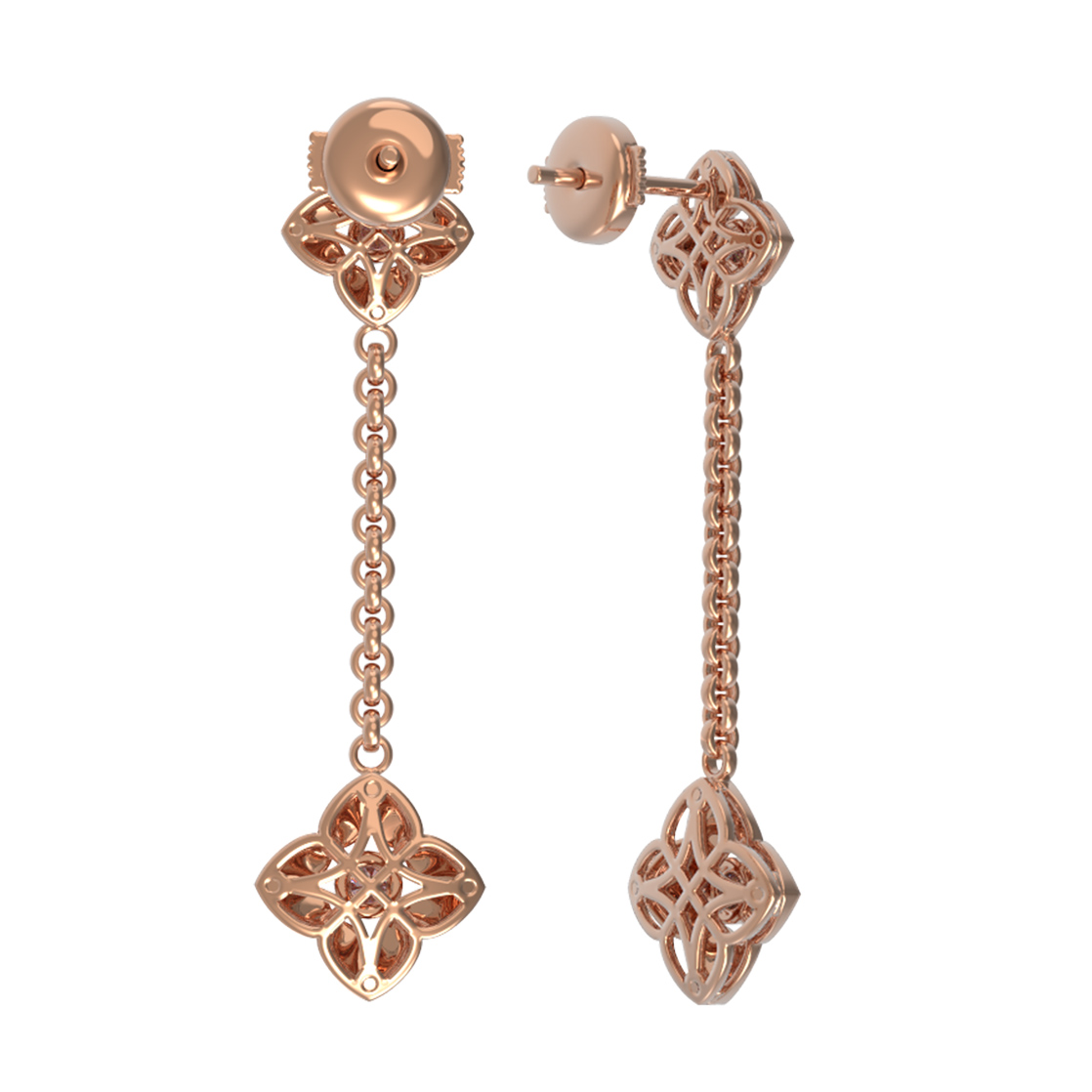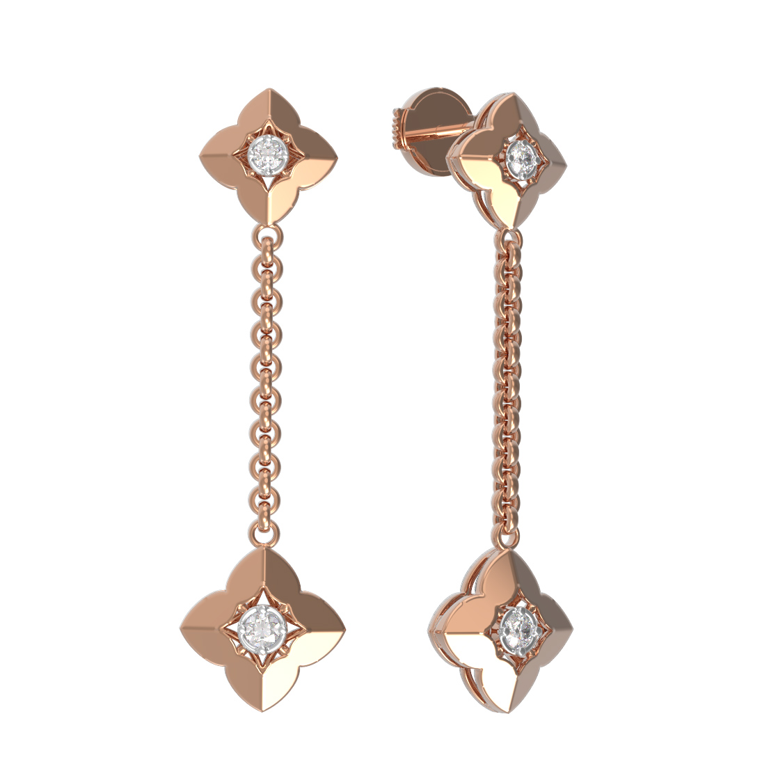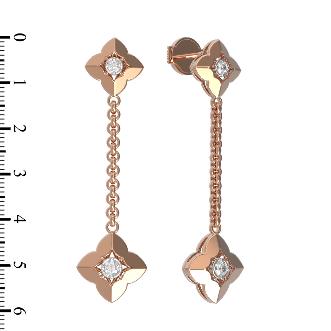 Изысканные серьги из красного золота 585 пробы представляют собой воплощение утонченного стиля и грации. Дизайн изделия, выполненный в форме нежных цветов, придает украшению особую романтичность и легкость. Центральным акцентом композиции стали четыре бриллианта круглой формы с чистым белым цветом вставок, которые эффектно сияют при каждом движении, приковывая восхищенные взгляды.