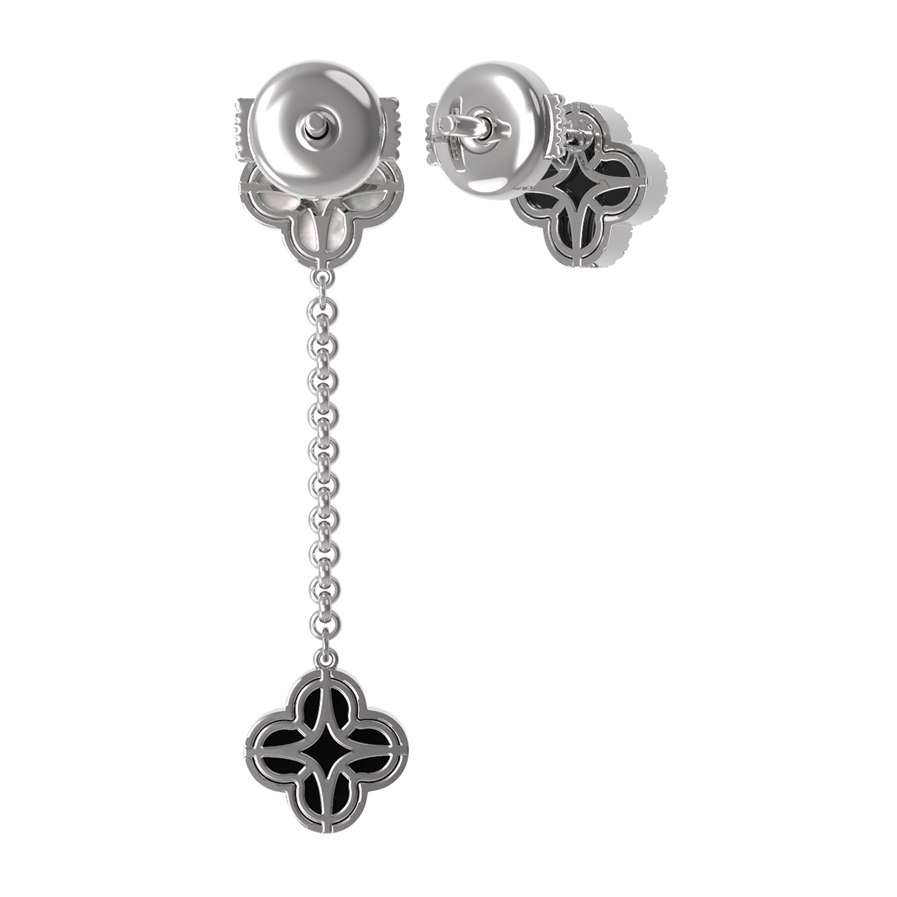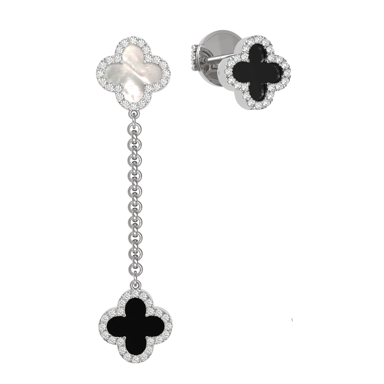 В центре внимания — изысканное сочетание вставок: глубокий черный оникс и нежный перламутр создают выразительный дуэт. Изящный облик изделия дополняют 74 круглых бриллианта, которые обрамляют каждый элемент, добавляя украшению ослепительное сияние и роскошь. Подвижная цепочка придает серьгам динамику и легкость, делая их заметным акцентом любого образа.