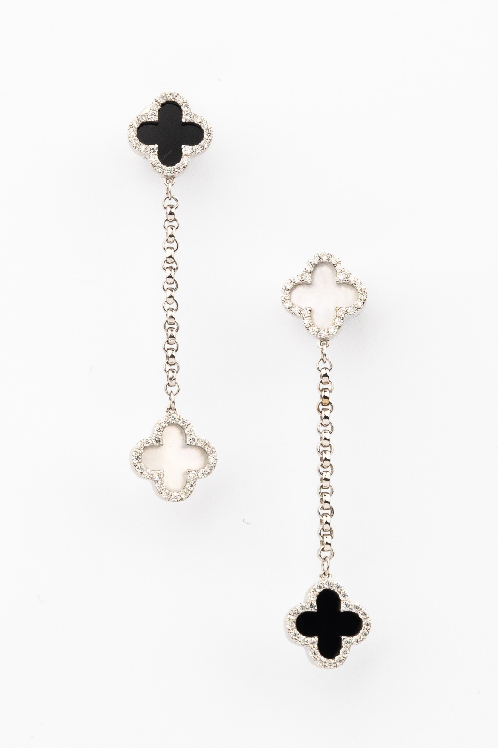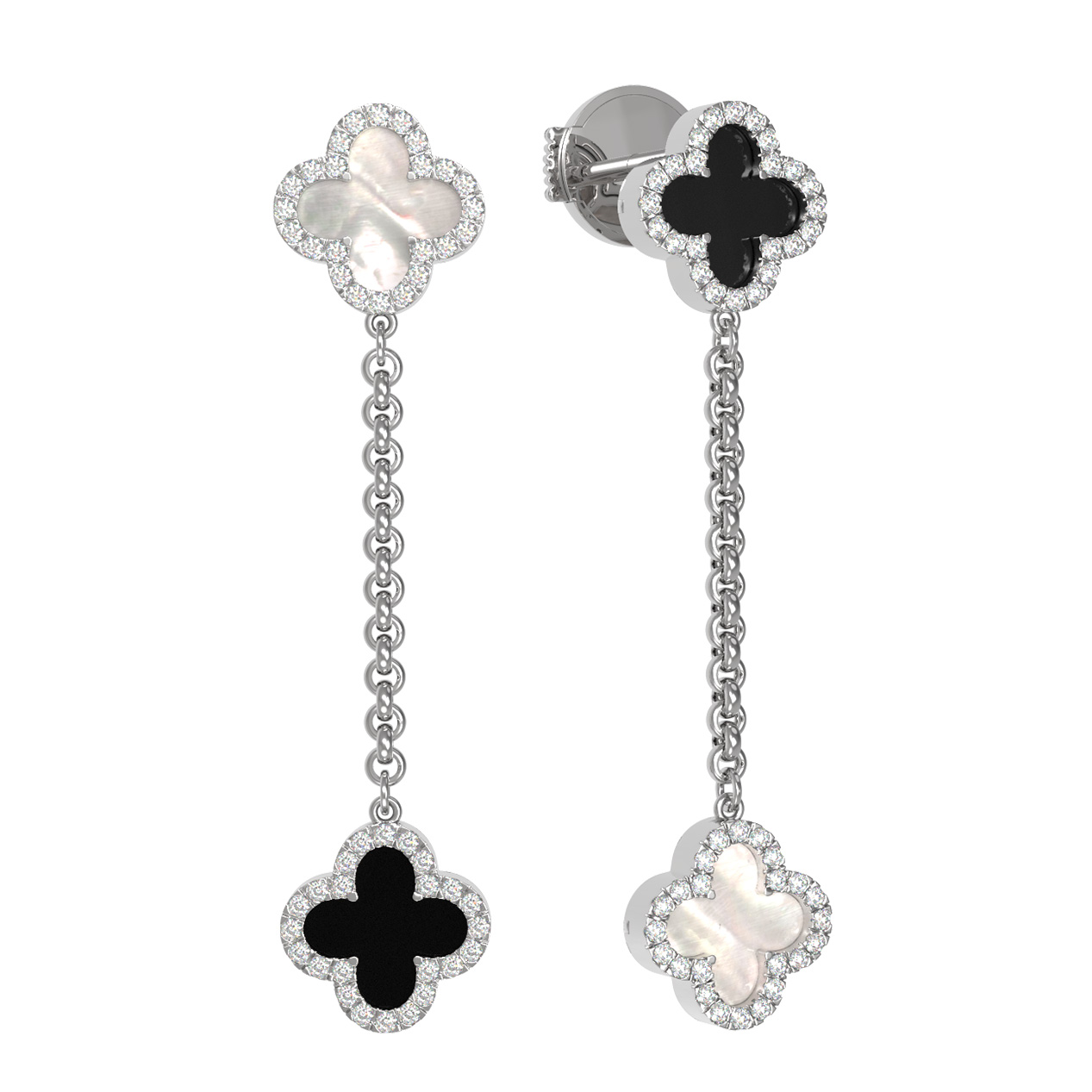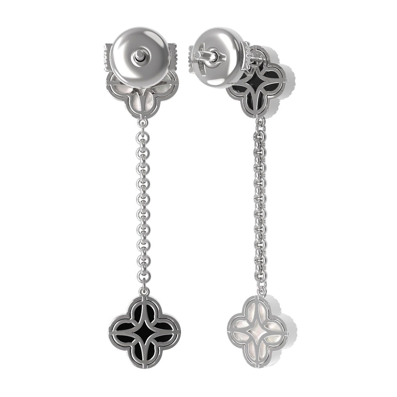 Центральными элементами композиции выступают вставки из черного оникса и светлого перламутра, которые эффектно перекликаются друг с другом, создавая гармоничный и глубокий образ. Изысканное мерцание дополняют 98 бриллиантов круглой огранки, которые обрамляют каждый лепесток клевера, создавая ореол роскошного сияния. Белое золото подчеркивает холодный блеск камней и чистоту оттенков вставок, делая аксессуар универсальным дополнением к любому образу.
