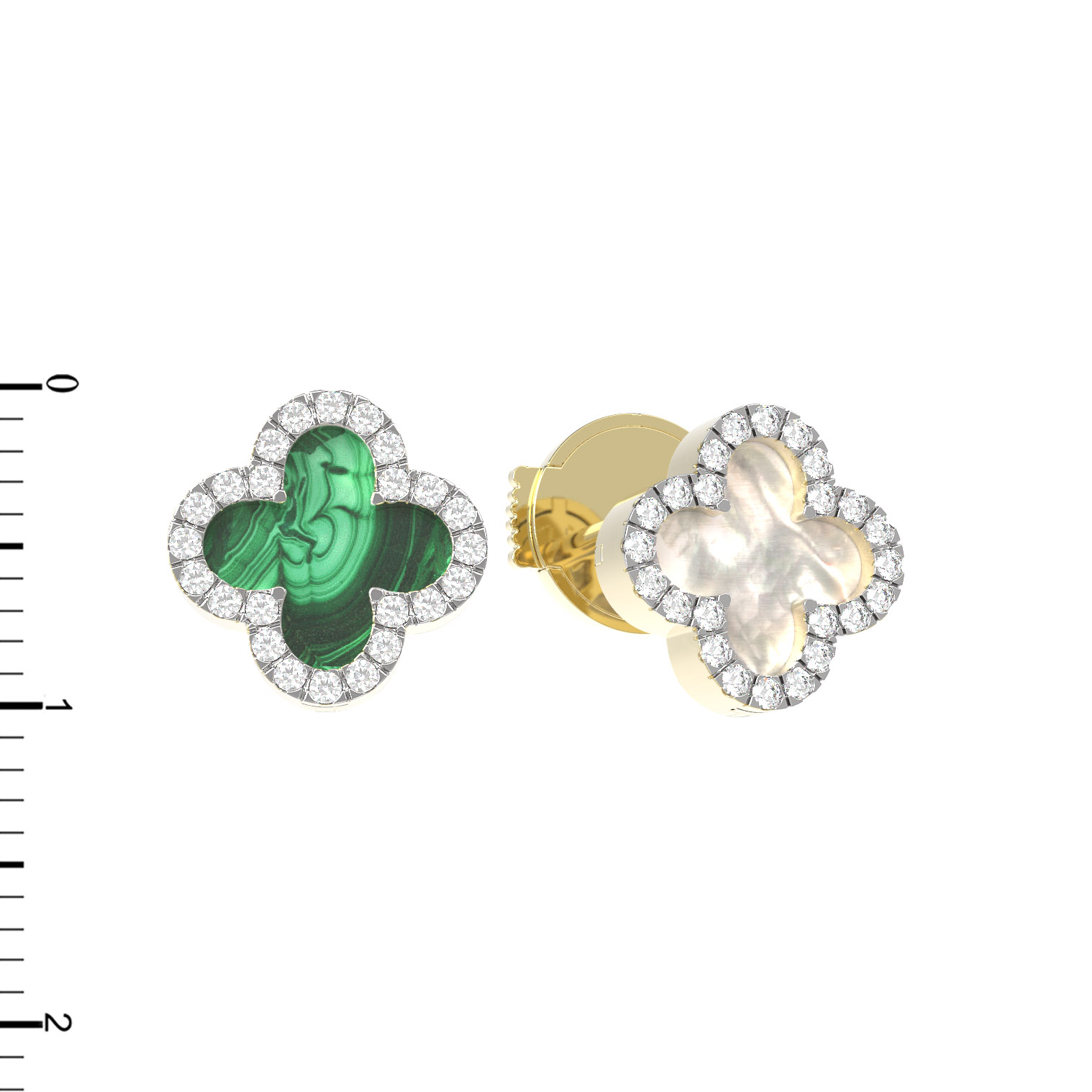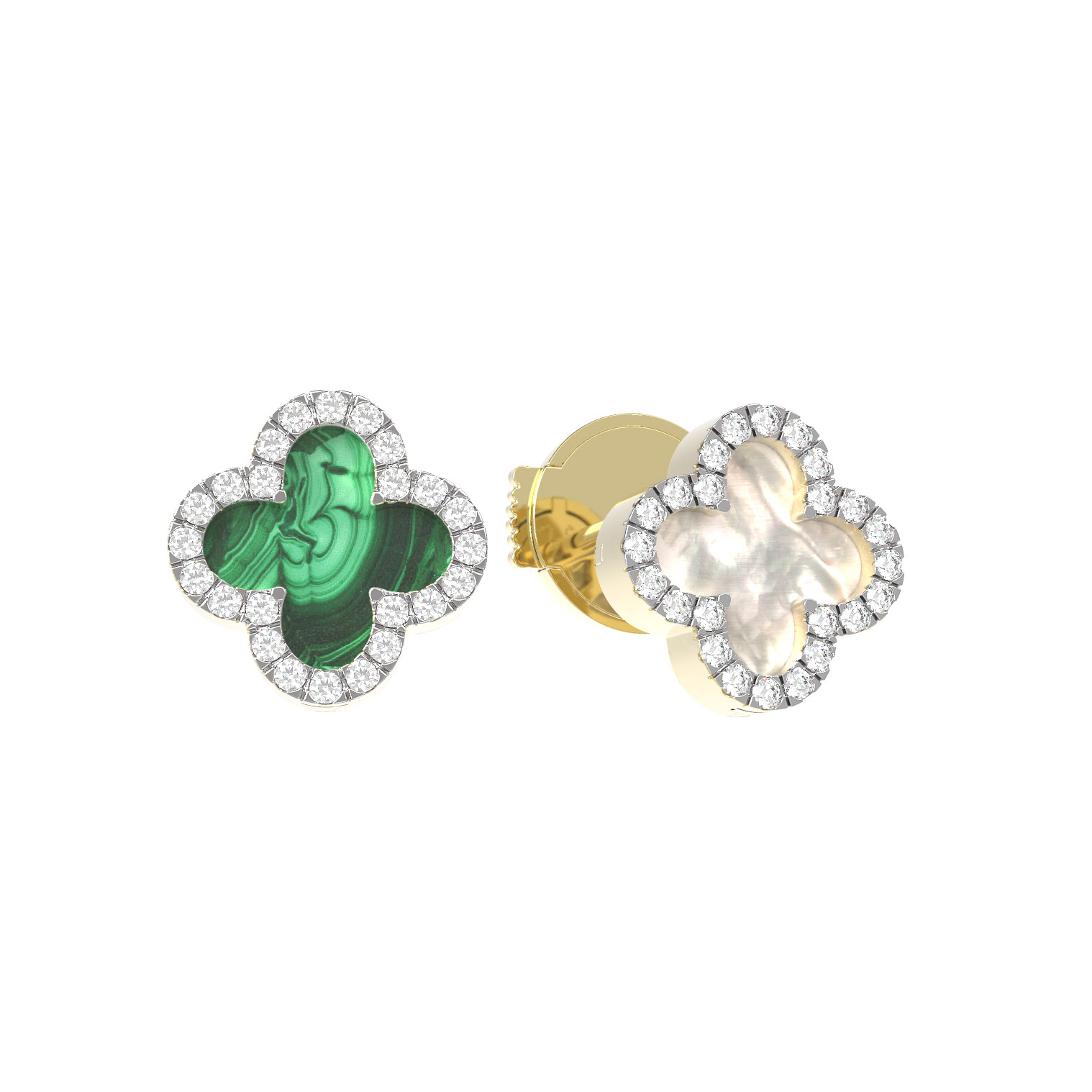 Главным акцентом композиции выступает сочетание натуральных материалов: благородного малахита глубокого зеленого цвета и нежного перламутра с мягким переливом. Каждая вставка имеет круглую форму и надежно закреплена, создавая безупречный визуальный баланс. Роскошное сияние обеспечивают 49 бриллиантов, которые изящно обрамляют центральные элементы, добавляя изделию яркости и выразительности.