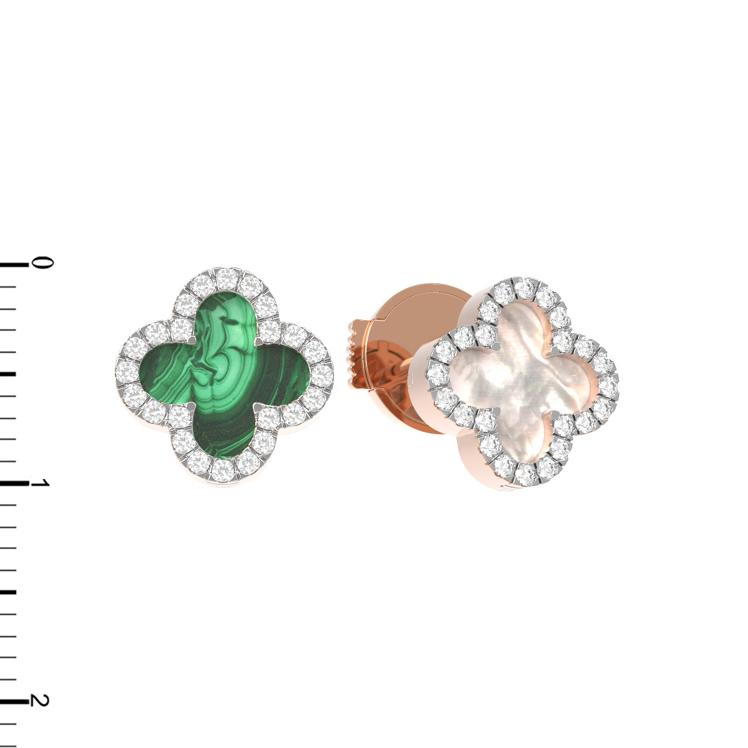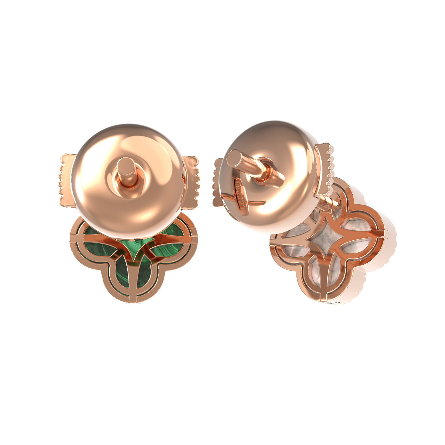 Композиция серег построена на контрасте и балансе материалов. В центре внимания — натуральный малахит глубокого зеленого цвета и нежный переливающийся перламутр, создающие уникальное цветовое сочетание. Роскошное сияние камням придают 49 бриллиантов круглой формы, которые обрамляют вставки и эффектно отражают свет при каждом движении.