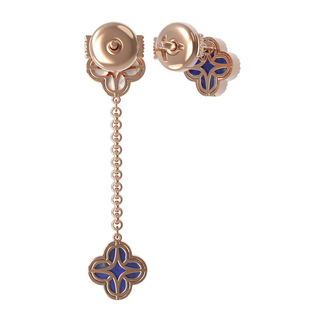 Особую выразительность изделию придает гармоничное сочетание материалов: благородного красного золота и контрастных вставок. Дизайнеры объединили классический блеск 74 круглых бриллиантов с глубоким, насыщенным синим цветом лазурита и нежным, переливающимся перламутром. Такая палитра делает серьги невероятно эффектными и запоминающимися. Благодаря выверенной геометрии и качественному исполнению, украшение комфортно располагается на мочке, создавая притягательный акцент.