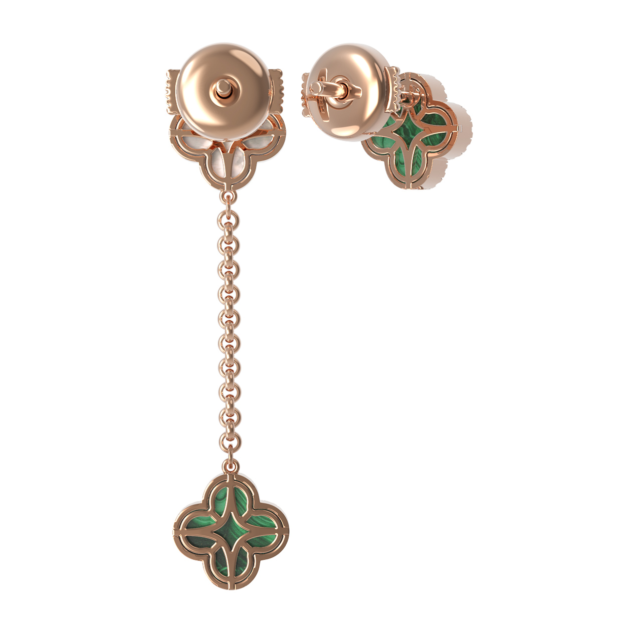 В центре композиции — эффектное сочетание натуральных материалов: глубокий зеленый малахит и нежный переливающийся перламутр создают контрастный и притягательный визуальный ряд. Особый шарм изделию придают 74 круглых бриллианта, которые обрамляют каждый элемент, создавая ослепительную игру света при каждом вашем движении.