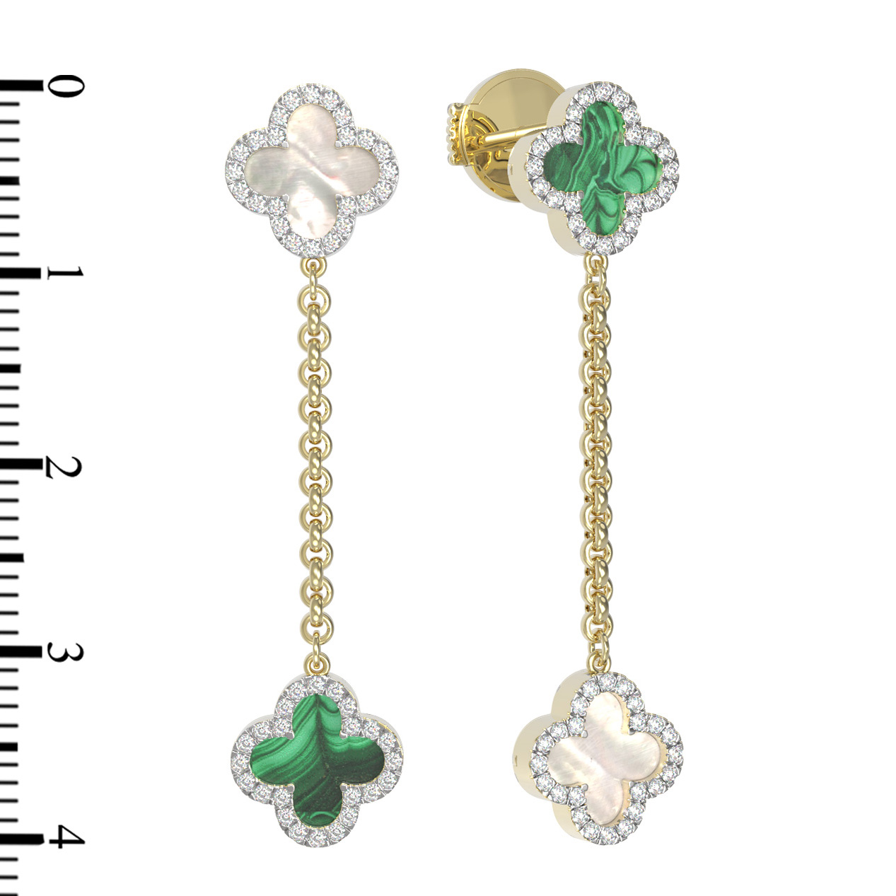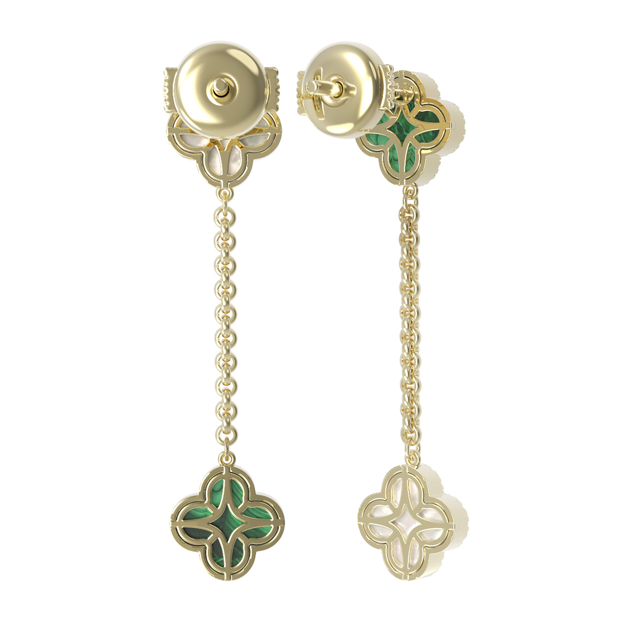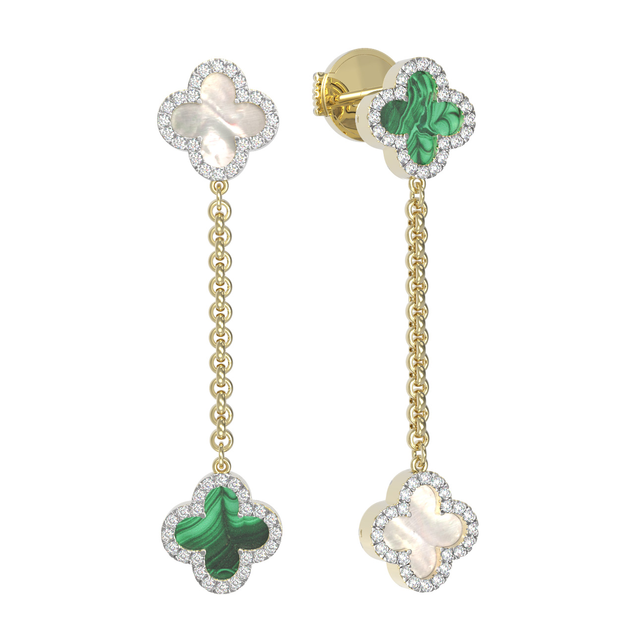 Особую выразительность украшению придает сочетание натуральных материалов: глубокий зеленый малахит и нежный перламутр создают утонченную игру цвета и фактур. Роскошное сияние обеспечивают 98 бриллиантов круглой формы, которые обрамляют каждый элемент клевера, создавая вокруг него яркий ореол. Благодаря подвижному соединению элементов, серьги эффектно покачиваются при движении, привлекая восхищенные взгляды.