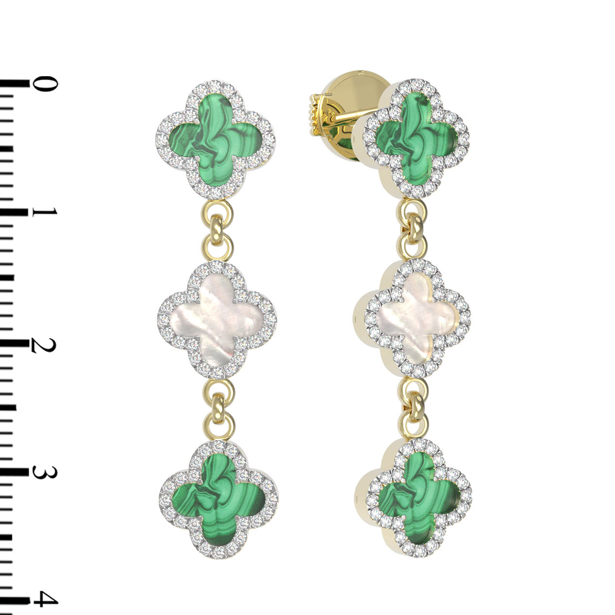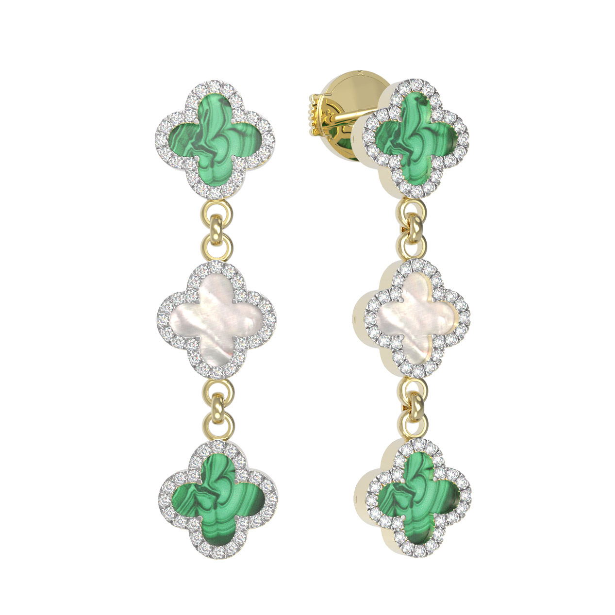 Композиция серег строится на чередовании драгоценных и полудрагоценных камней: насыщенный зеленый малахит здесь соседствует с нежным, переливающимся перламутром. Весь периметр каждой вставки окружен сияющей россыпью из 148 бриллиантов круглой формы, которые добавляют украшению благородного блеска. Контраст белого сияния бриллиантов, глубокого зеленого цвета вставок и мягкого перламутра делает эти серьги настоящим произведением искусства.