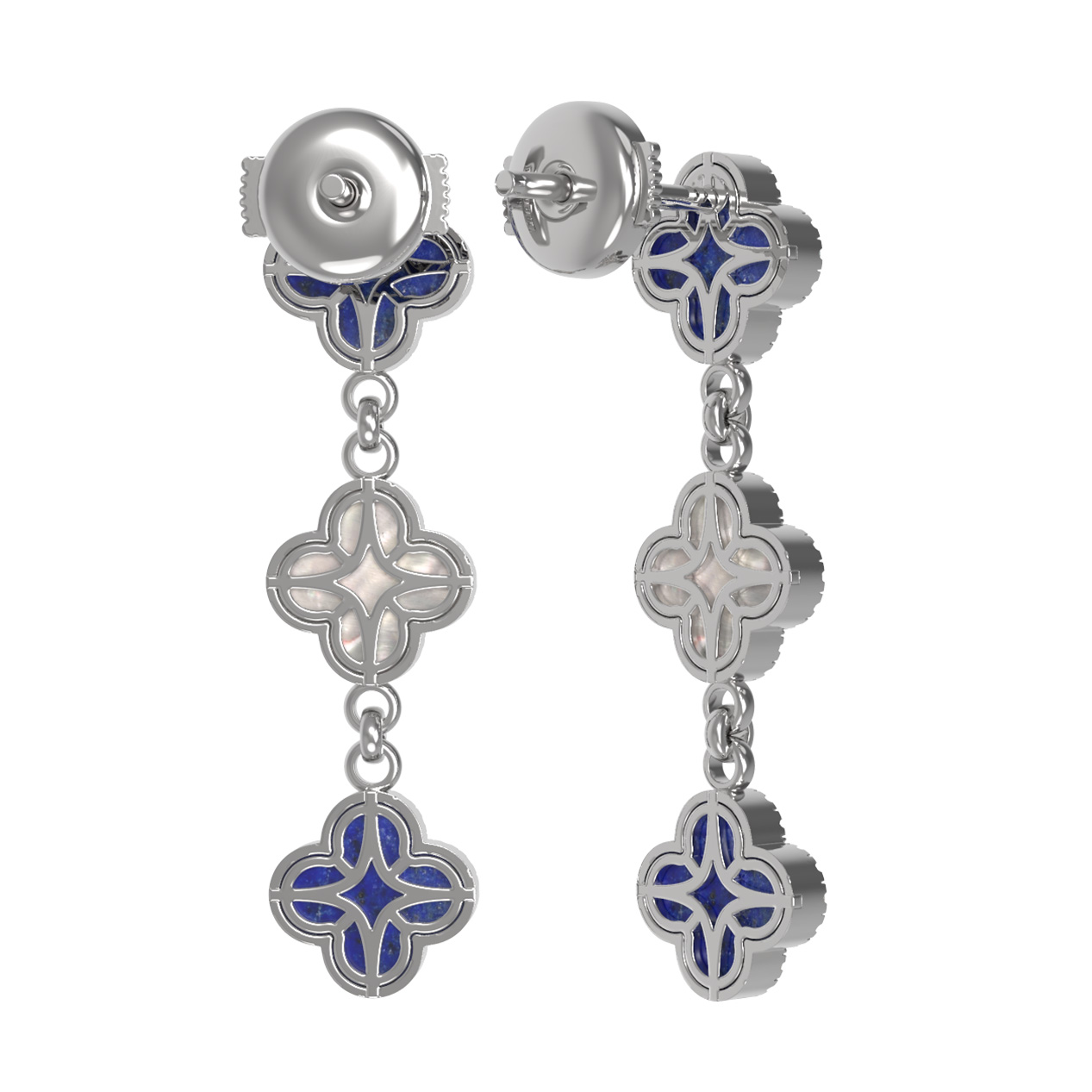 Эффектные серьги из белого золота 585 пробы из коллекции De Luxe — Цветок клевера — Бриллианты станут безупречным акцентом вашего образа. Изысканный дизайн в форме клевера объединяет классическую роскошь и современные ювелирные тренды, привлекая внимание своей гармоничностью и глубиной красок. В центре композиции расположены контрастные вставки: насыщенный синий лазурит и нежный перламутр, которые создают неповторимую игру оттенков в каждом движении.