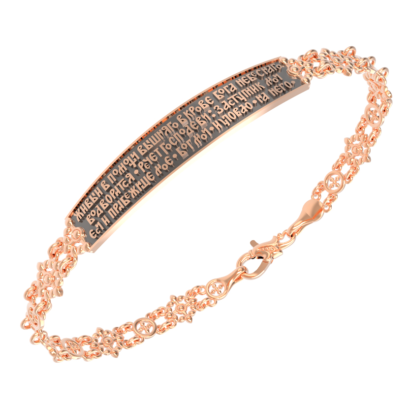 На основном звене браслета написана молитва: «Живый в помощи Вышняго, в крове Бога Небеснаго водворится. Речет Господеви: Заступник мой еси и Прибежище мое, Бог мой, и уповаю на Него.»