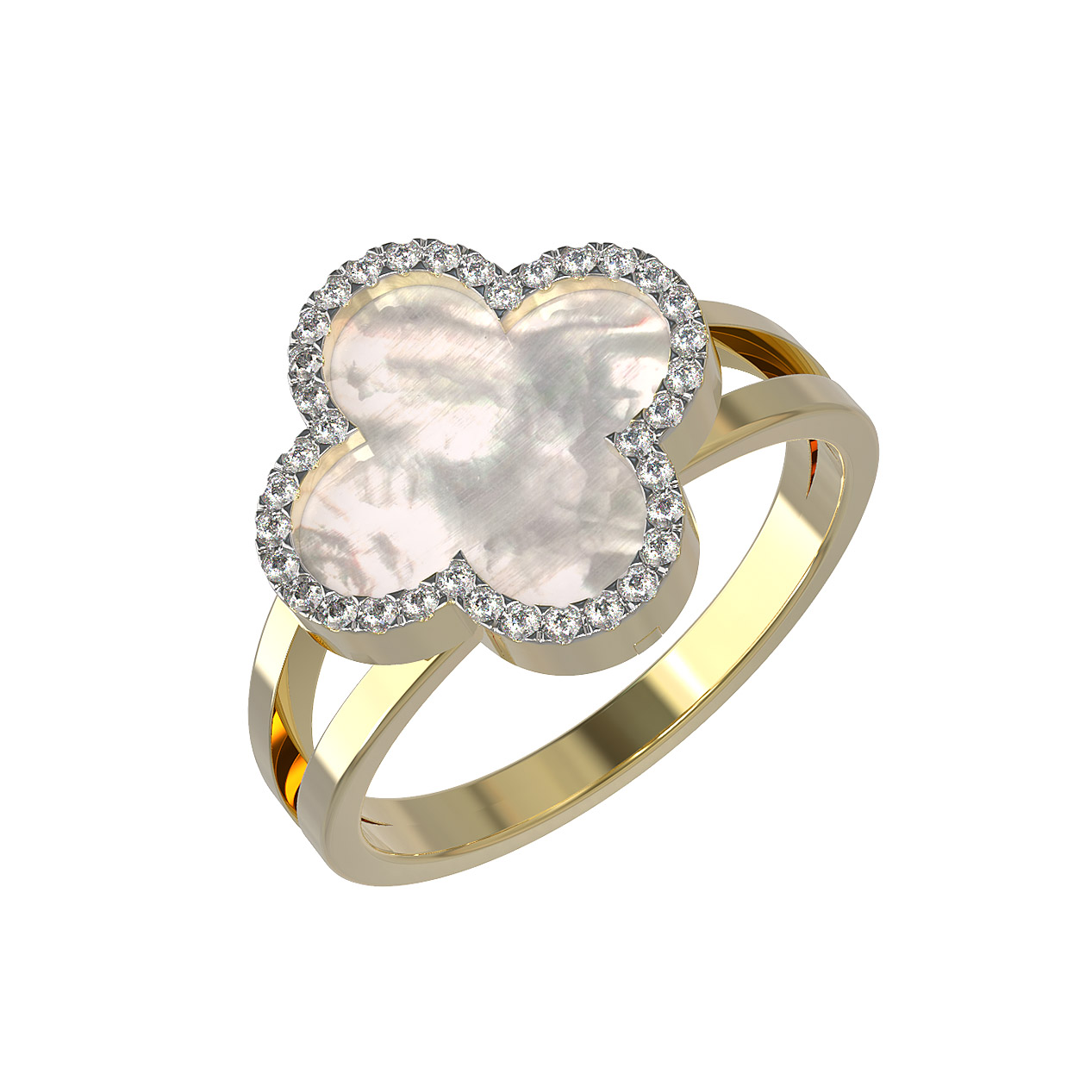 Изысканное кольцо из лимонного золота 585 пробы из коллекции De Luxe — Цветок клевера — Бриллианты станет безупречным акцентом вашего образа. Дизайн украшения воплощает в себе вечную классику — форму цветка клевера, которая привлекает внимание своей лаконичностью и глубоким символизмом. Центральным элементом композиции выступает перламутр, чье мягкое, переливающееся сияние создает благородный контраст с теплым оттенком металла.