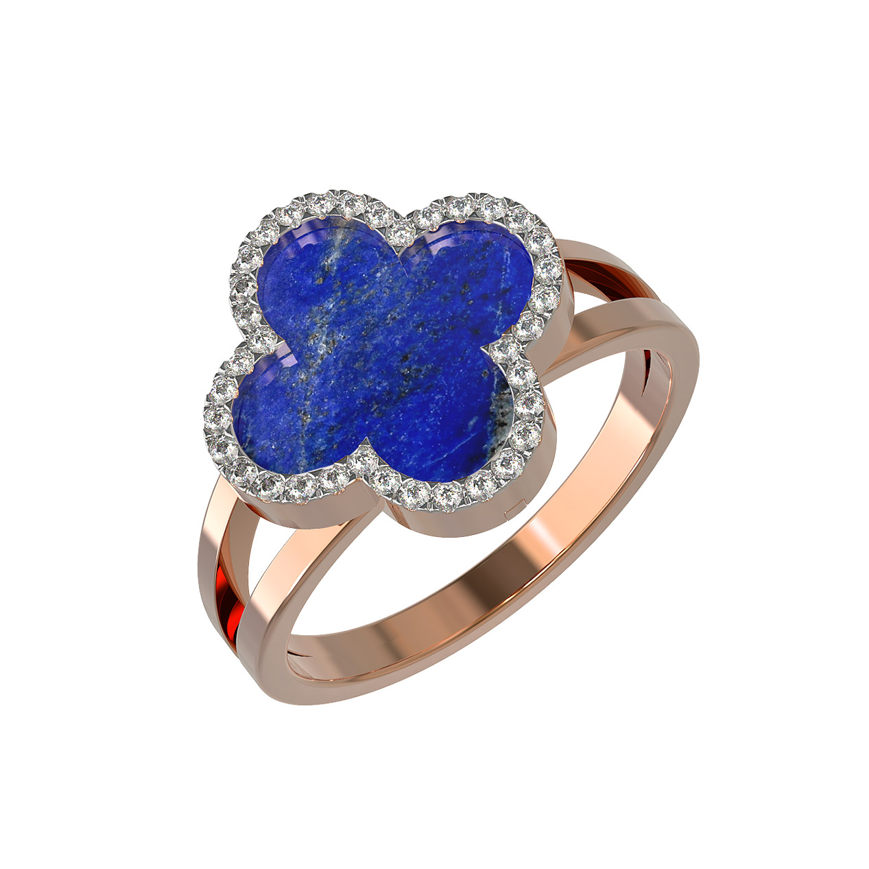 В центре композиции расположен насыщенный синий лазурит, чья глубокая текстура создает эффектный контраст с ослепительным сиянием вставок. Роскошная инкрустация, насчитывающая 37 бриллиантов круглой формы, деликатно обрамляет цветок, придавая кольцу особое мерцание. Белый цвет камней подчеркивает холодный блеск драгоценных вставок, создавая завершенный и гармоничный образ.
