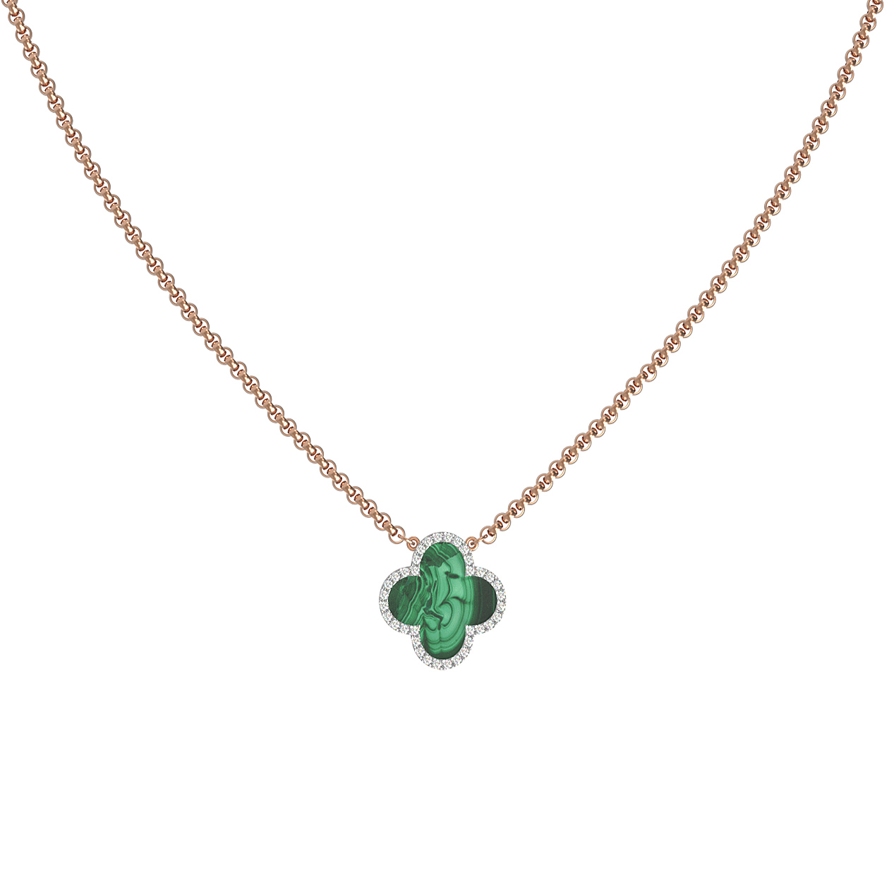 Контраст теплого оттенка красного золота, глубокого зеленого цвета малахита и чистого белого блеска бриллиантов делает это колье по-настоящему статусным аксессуаром. Лаконичная цепочка подчеркивает изящество подвески, привлекая внимание к зоне декольте. Универсальный дизайн позволяет использовать это украшение как женщинам, так и мужчинам, ценящим высокое ювелирное искусство. Изделие доступно в размерах 40 и 45, что позволяет подобрать идеальную длину для любого наряда.