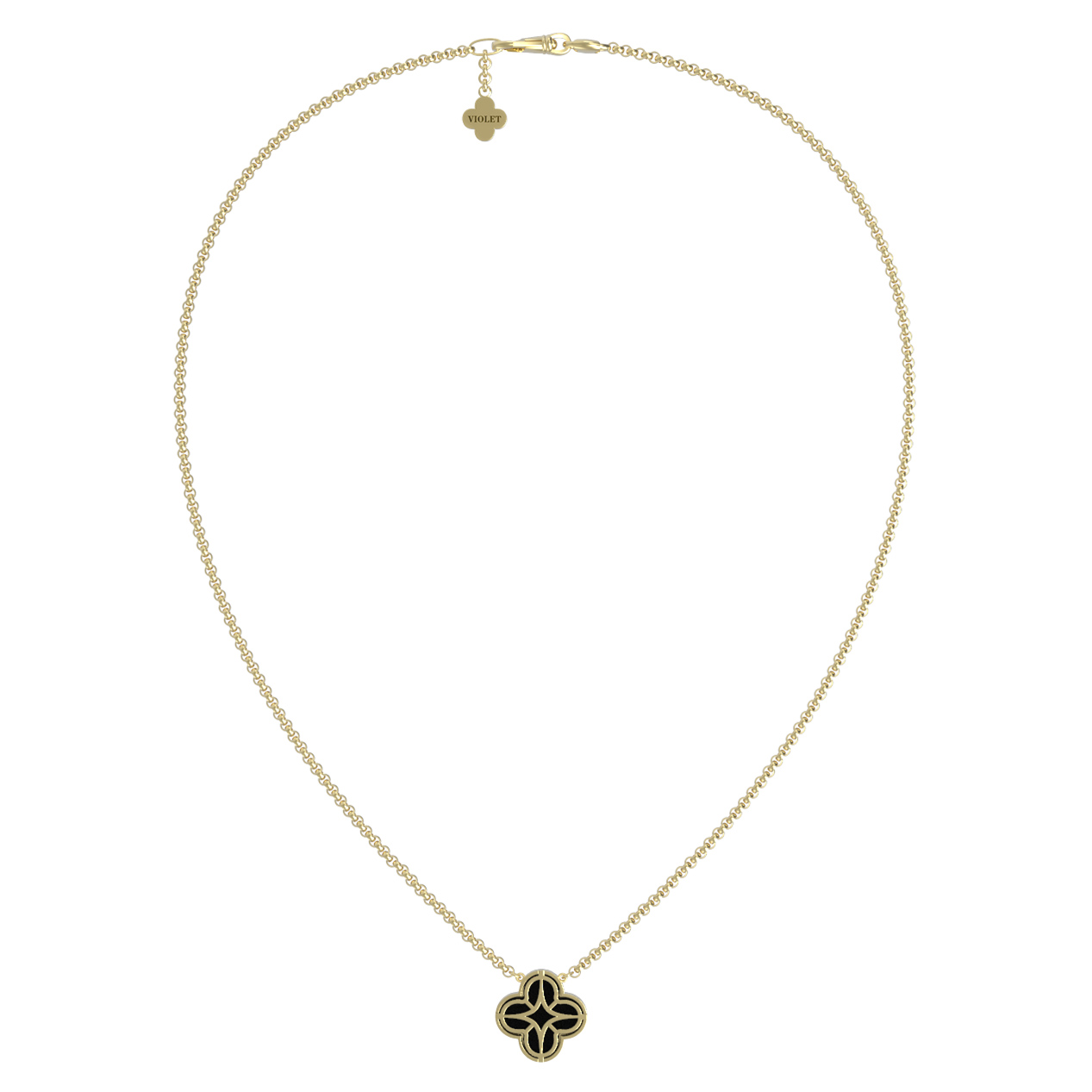 Изысканное колье из лимонного золота 585 пробы из коллекции De Luxe — Цветок клевера — Бриллианты станет безупречным акцентом вашего образа. Дизайн украшения выполнен в форме четырехлистного клевера, который неизменно ассоциируется с удачей и гармонией. Центральный элемент изделия инкрустирован глубоким черным ониксом, создающим эффектный контраст с благородным лимонным оттенком золота.