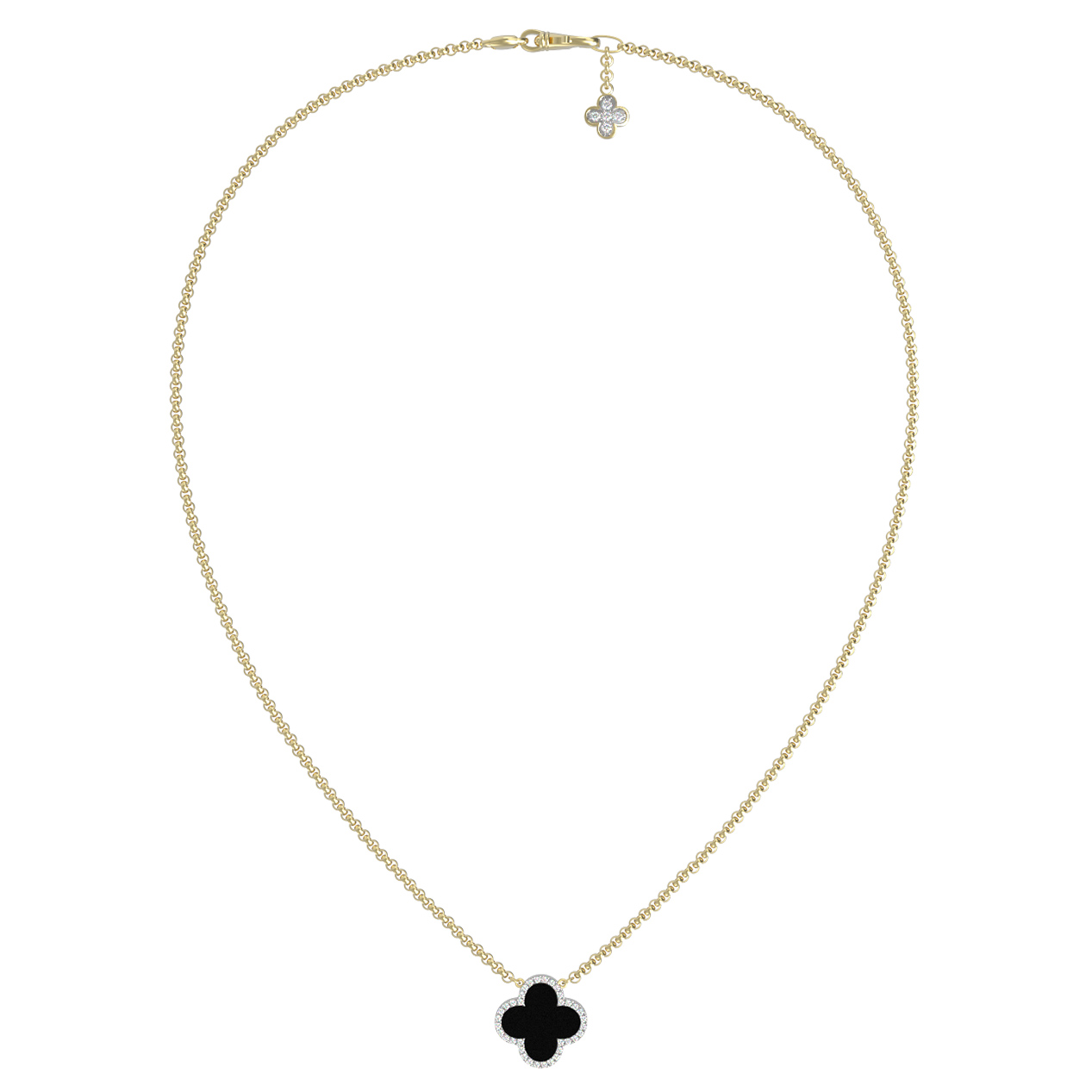 Роскошный блеск композиции придают 84 круглых бриллианта, обрамляющих клевер по контуру. Игра белых сверкающих камней на фоне темного оникса делает это колье по-настоящему выразительным и статусным украшением. Ювелирное изделие гармонично сочетает в себе классические мотивы и современные тенденции.