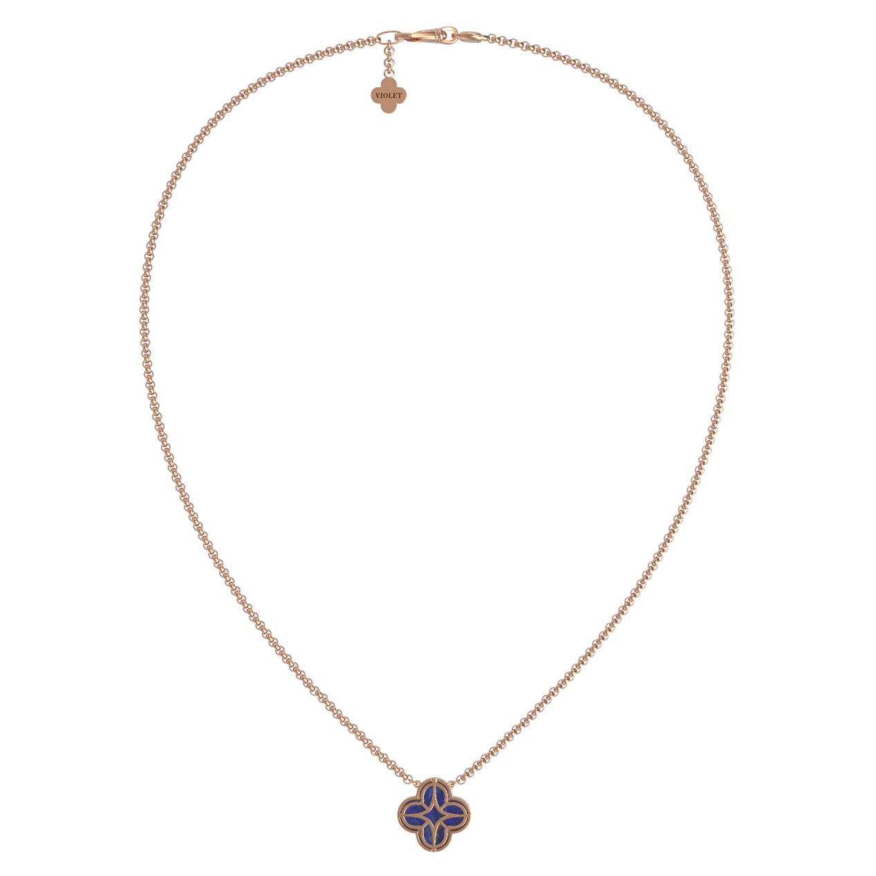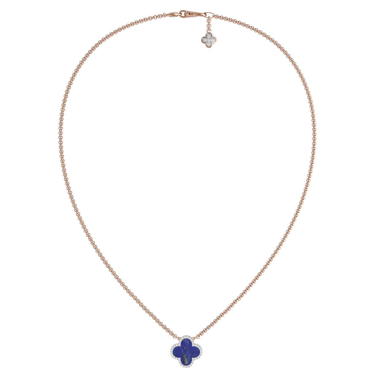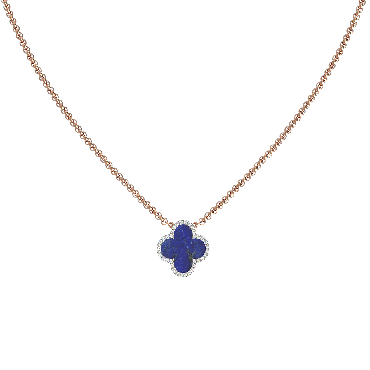Элегантное колье из красного золота 585 пробы станет изысканным акцентом вашего образа. Дизайн украшения, выполненный в форме символичного четырехлистного клевера, притягивает взгляд и подчеркивает безупречный вкус владельца. Глубокий, насыщенный синий оттенок лазурита в центре изделия эффектно контрастирует с теплым сиянием драгоценного металла, создавая гармоничный и статусный дуэт. Окантовка из 84 сияющих бриллиантов круглой формы добавляет украшению роскошного блеска и делает его невероятно выразительным.