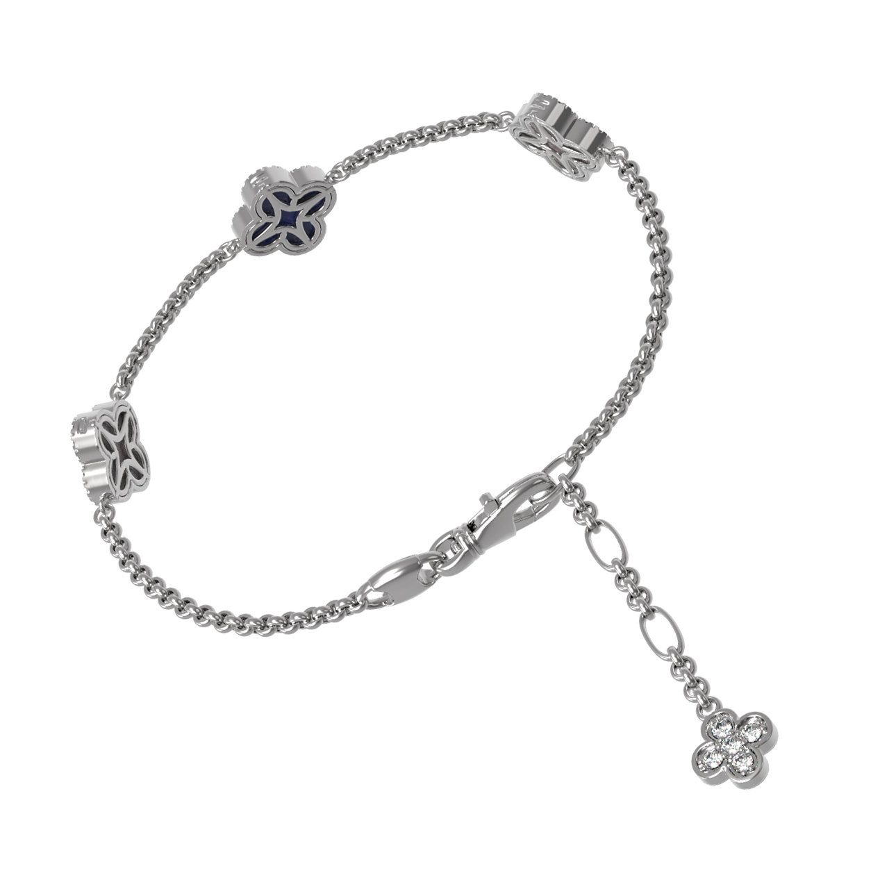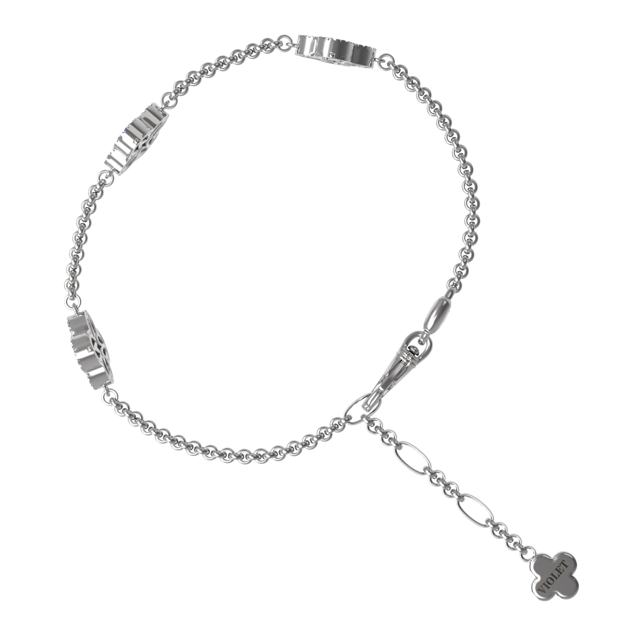 Изысканный браслет из коллекции De Luxe — Цветок клевера — Бриллианты воплощает гармонию роскоши и утонченного стиля. Основа изделия выполнена из благородного белого золота 585 пробы, чей холодный блеск идеально подчеркивает красоту драгоценных вставок. Дизайн украшения строится вокруг изящного символа клевера, который придает образу нежность и нотку романтики.