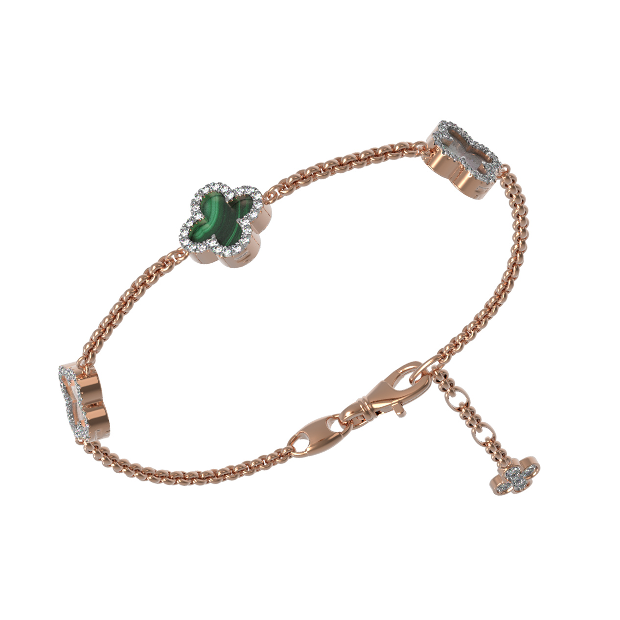 Элегантный браслет из коллекции De Luxe — Цветок клевера — Бриллианты — воплощение утонченности и высокого ювелирного искусства. Изделие выполнено из благородного красного золота 585 пробы, которое подчеркивает теплоту и изысканность дизайна. Основным акцентом украшения выступает узнаваемый мотив — цветок клевера. Эта гармоничная форма дополнена сочетанием природных минералов: насыщенного зелёного малахита и нежного перламутра, создающих выразительный контраст.