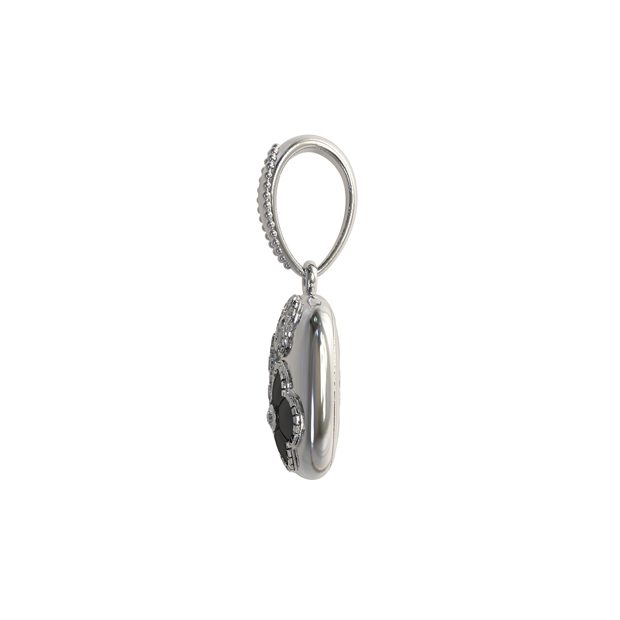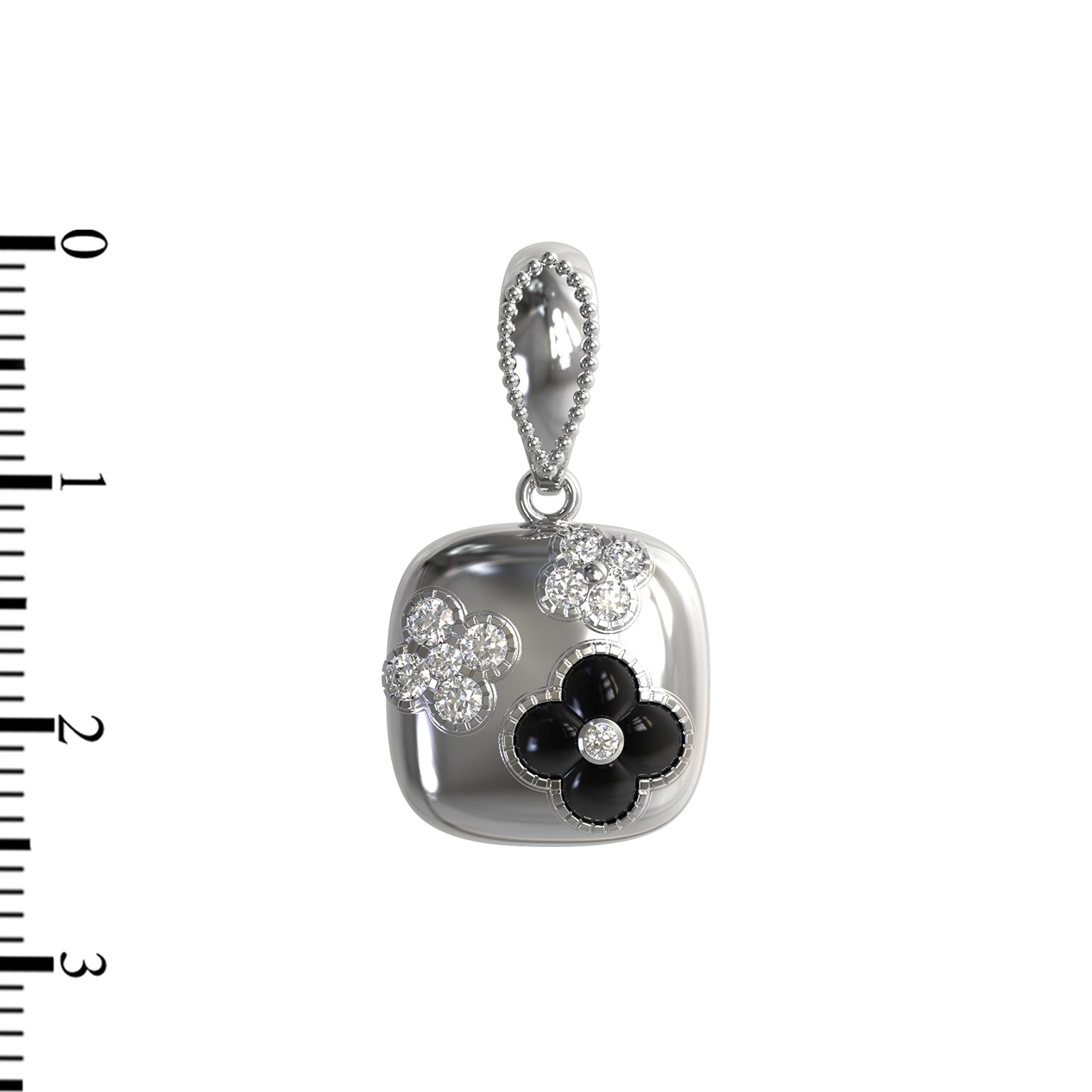 Центральным элементом композиции является изящный четырехлистник, выполненный из глубокого черного оникса, в сердцевине которого сверкает круглый бриллиант. Дополнительную выразительность и роскошное сияние подвеске придают акцентные декоративные элементы в виде цветов, украшенные россыпью бриллиантов. Всего в изделии использовано 11 вставок, гармонично сочетающих белый и черный цвета.