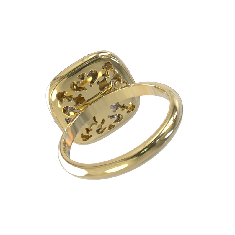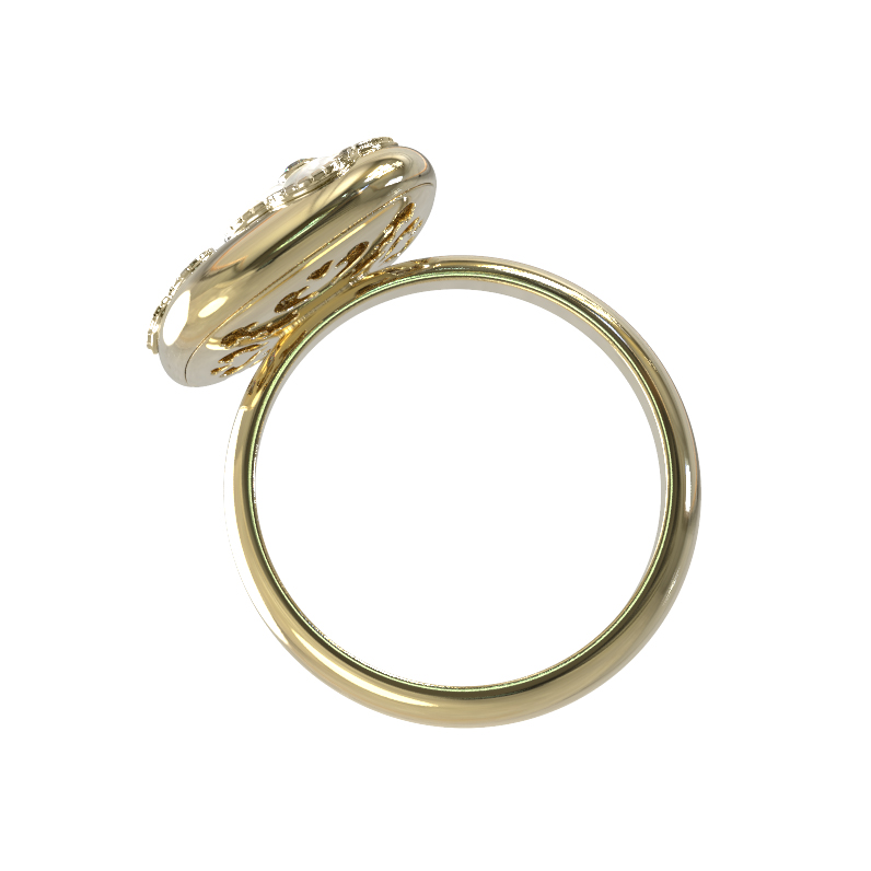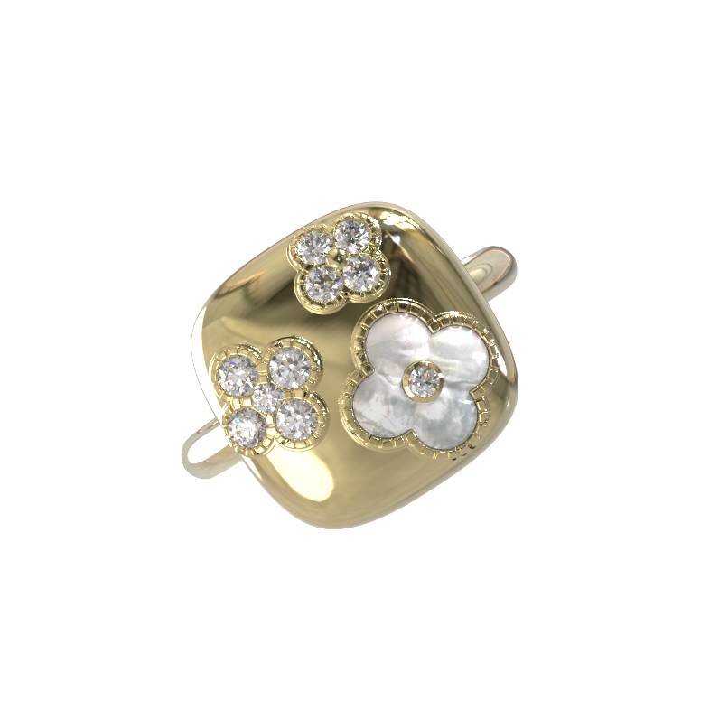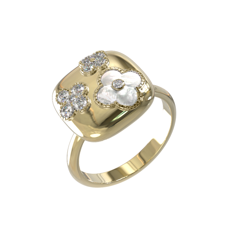 Декоративная часть кольца инкрустирована 10 вставками, среди которых сияющие бриллианты белого цвета и нежный перламутр с его природным переливом. Такое сочетание материалов придает изделию утонченность и статусность. Поверхность из лимонного золота подчеркивает чистоту блеска камней, создавая игру света при каждом движении руки.