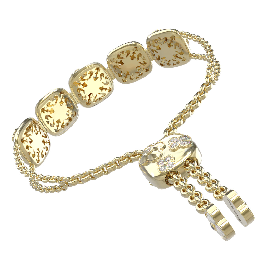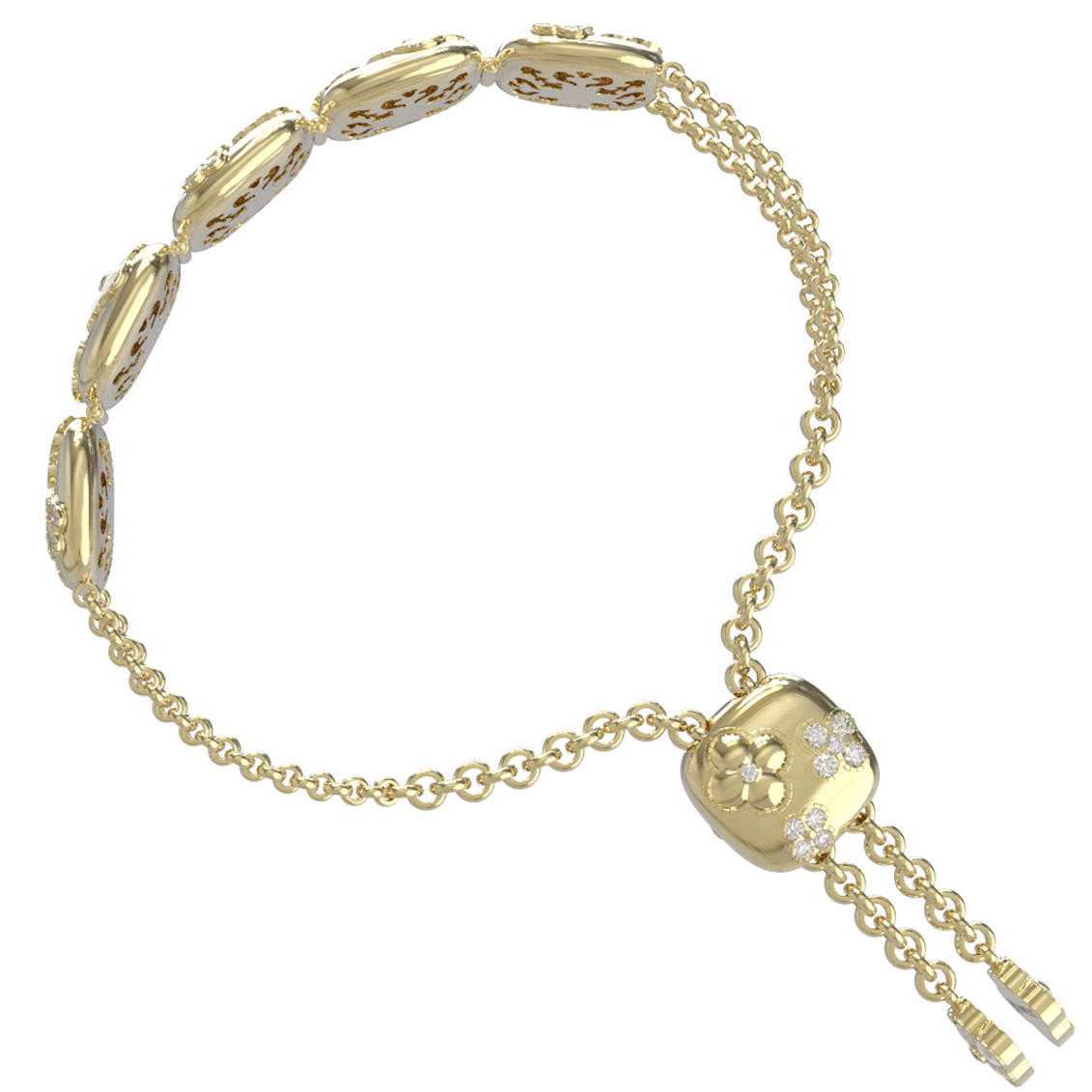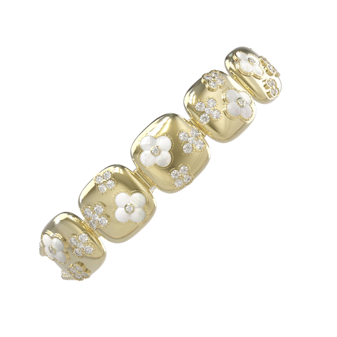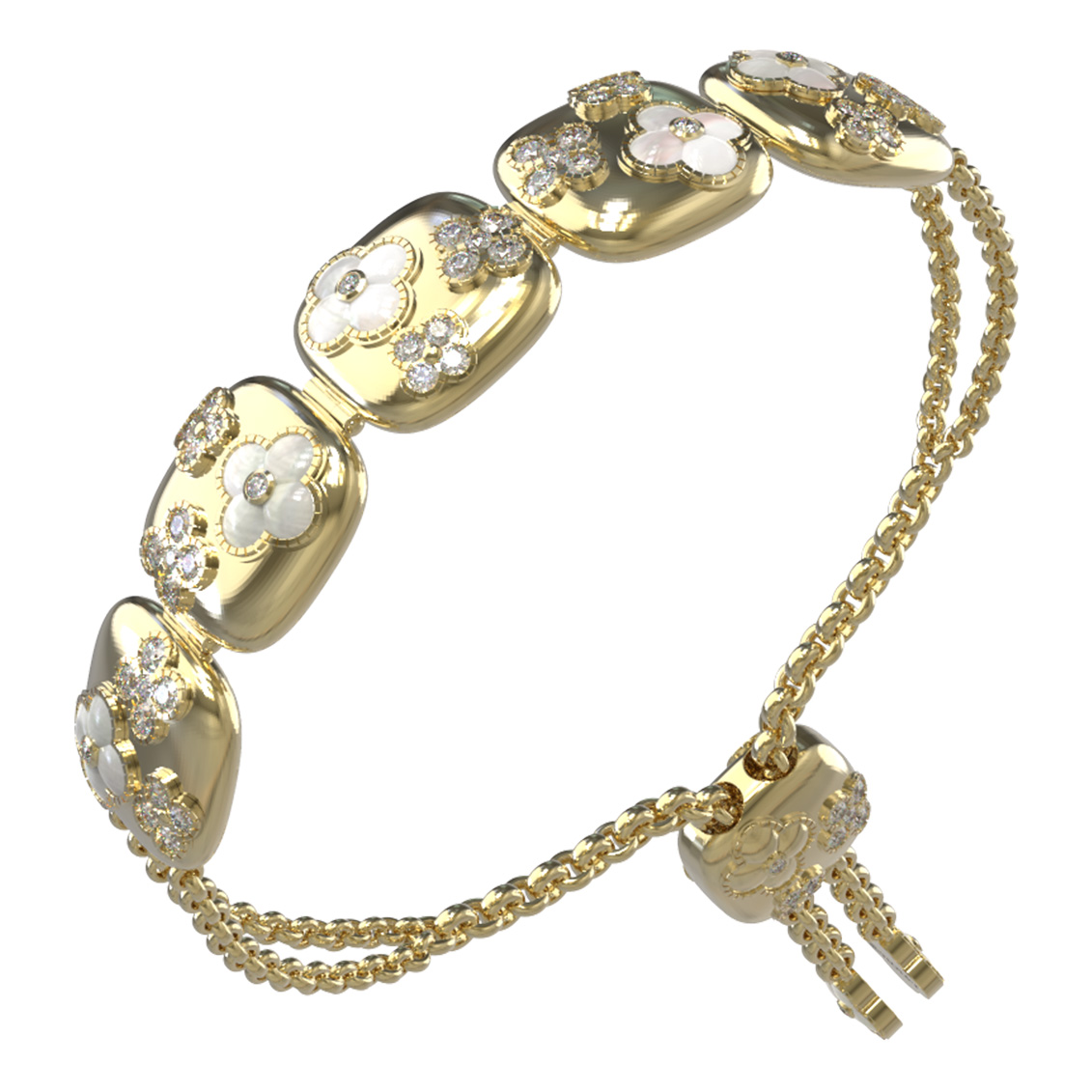 В центре композиции расположены вставки в форме четырехлистника, которые придают украшению особенный шарм и легкость. Нежный белый перламутр мягко переливается на свету, создавая эффект глубины, а 72 круглых бриллианта добавляют изделию роскошный блеск. Универсальный дизайн позволяет носить этот браслет как женщинам, так и мужчинам, предпочитающим утонченные аксессуары.