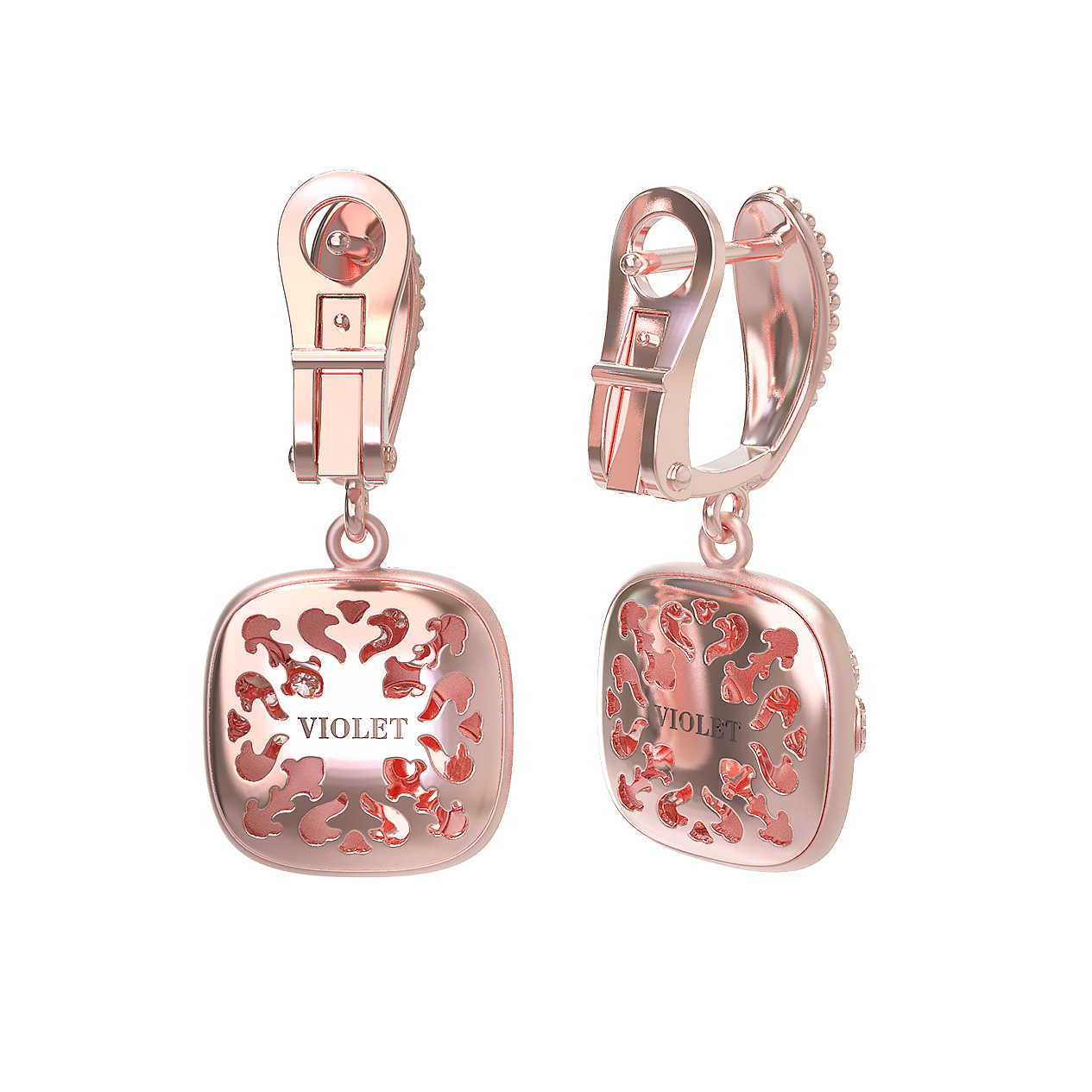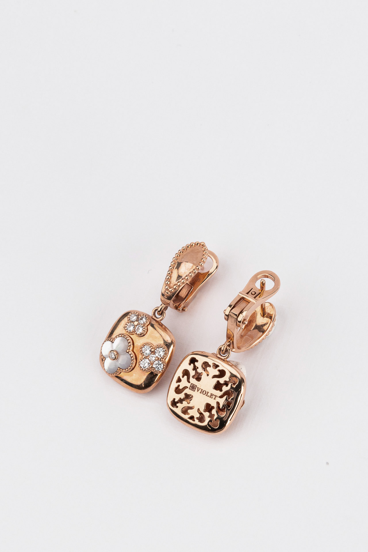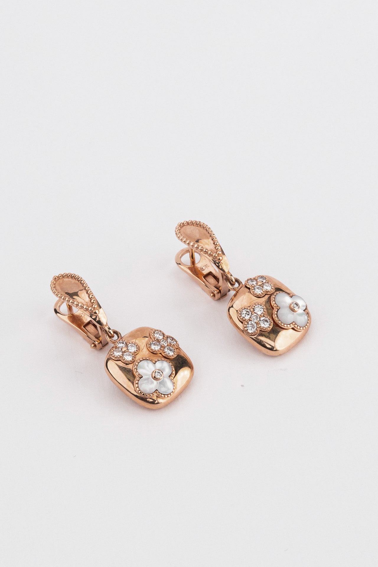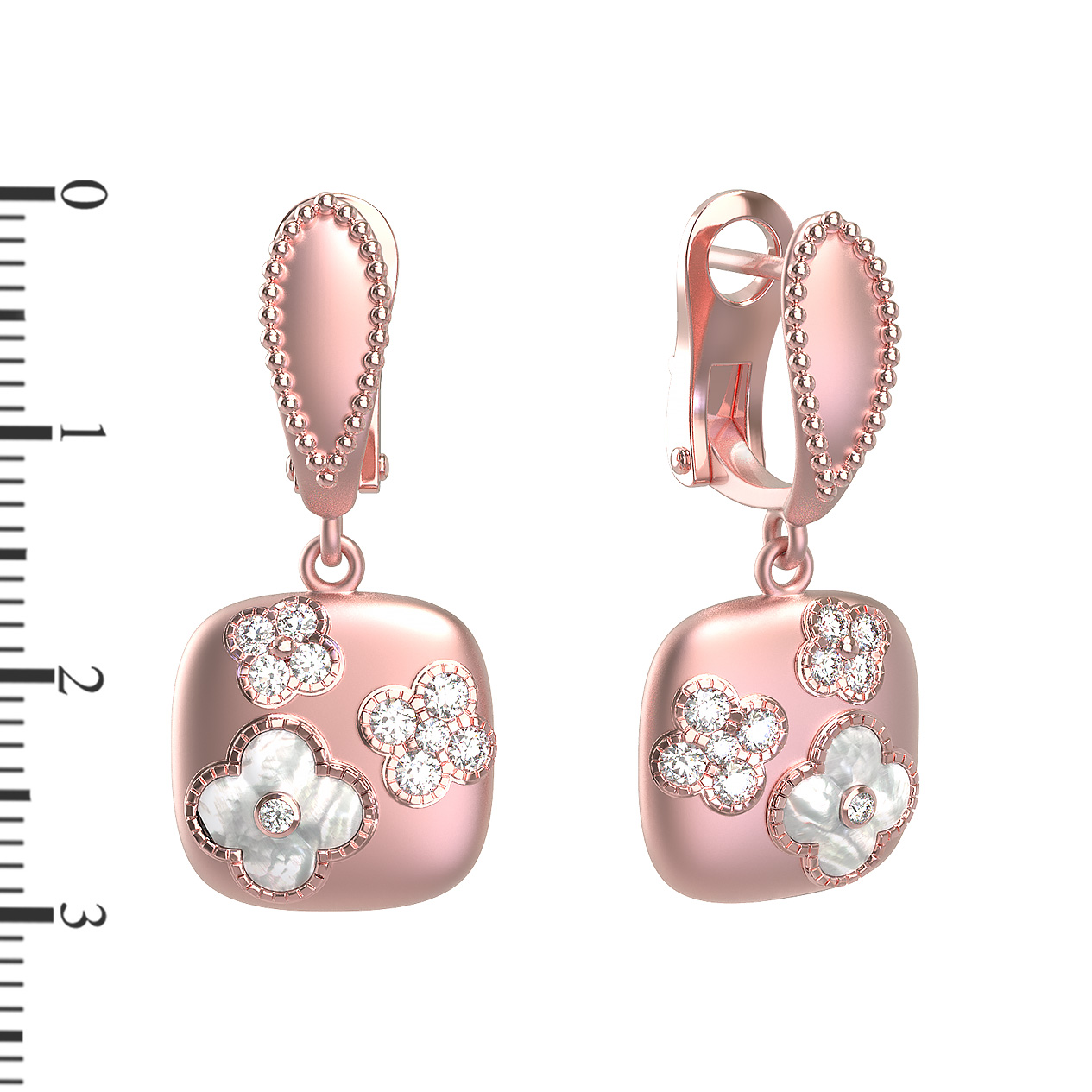 Изящные серьги из розового золота 585 пробы из коллекции De Luxe — Цветок Флоренции станут воплощением утонченного стиля и природной гармонии в вашем образе. Дизайн изделия вдохновлен нежными флористическими мотивами, где центральным элементом выступают изящные цветы. Ювелиры с мастерством подобрали сочетание материалов: мягкое сияние розового металла подчеркивается благородным перламутром белого цвета и искристыми бриллиантами. Форма вставок в виде четырехлистника и круга создает динамичную и притягательную композицию, которая притягивает взгляд.