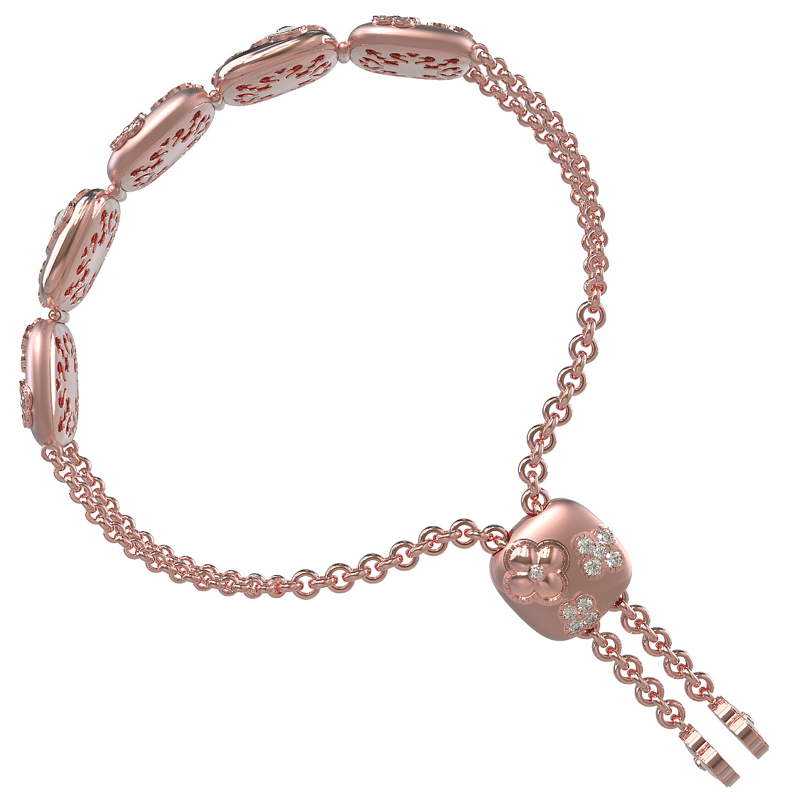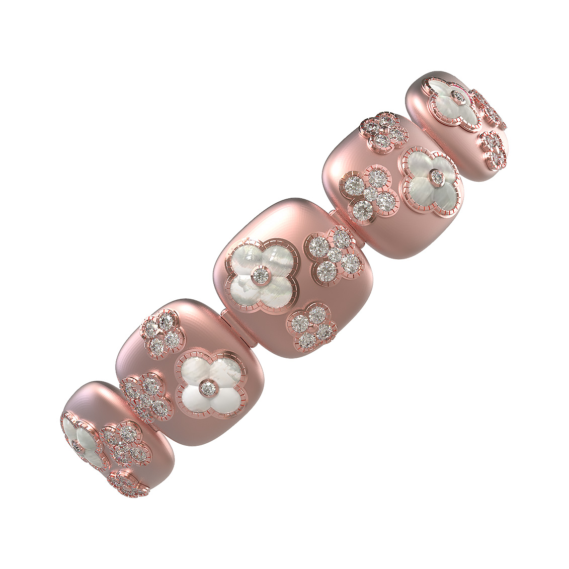 Центральным элементом композиции стали вставки в форме четырёхлистников, украшенные сияющим перламутром белого цвета. Нежное мерцание перламутра гармонично дополняется россыпью из 72 бриллиантов круглой огранки, которые привносят в изделие роскошный блеск и динамику. Тщательно продуманный дизайн, сочетающий классические формы и современные ювелирные техники, делает этот браслет универсальным аксессуаром.