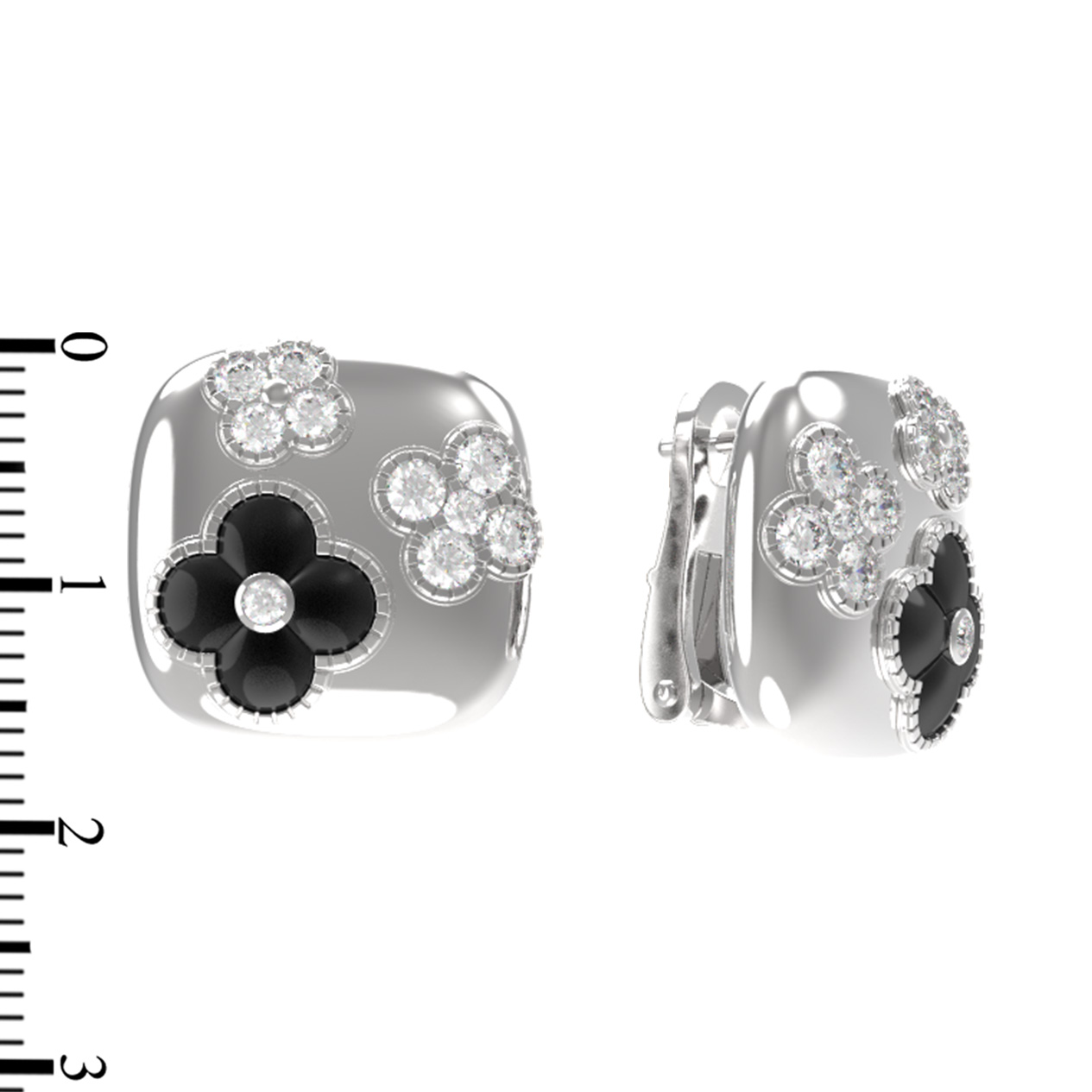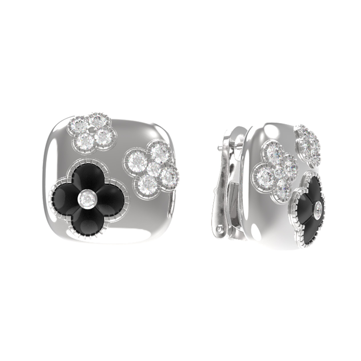 Композиция украшения строится на изящном сочетании черного оникса и сверкающих бриллиантов. Всего в изделии использовано 22 вставки, которые создают неповторимую игру света и тени. Центральным элементом дизайна выступает форма четырехлистника, которая изящно обыгрывает геометрию цветка. Круглые бриллианты добавляют изделию сияния и объема, в то время как глубокий черный цвет оникса придает украшению строгость и выразительность.