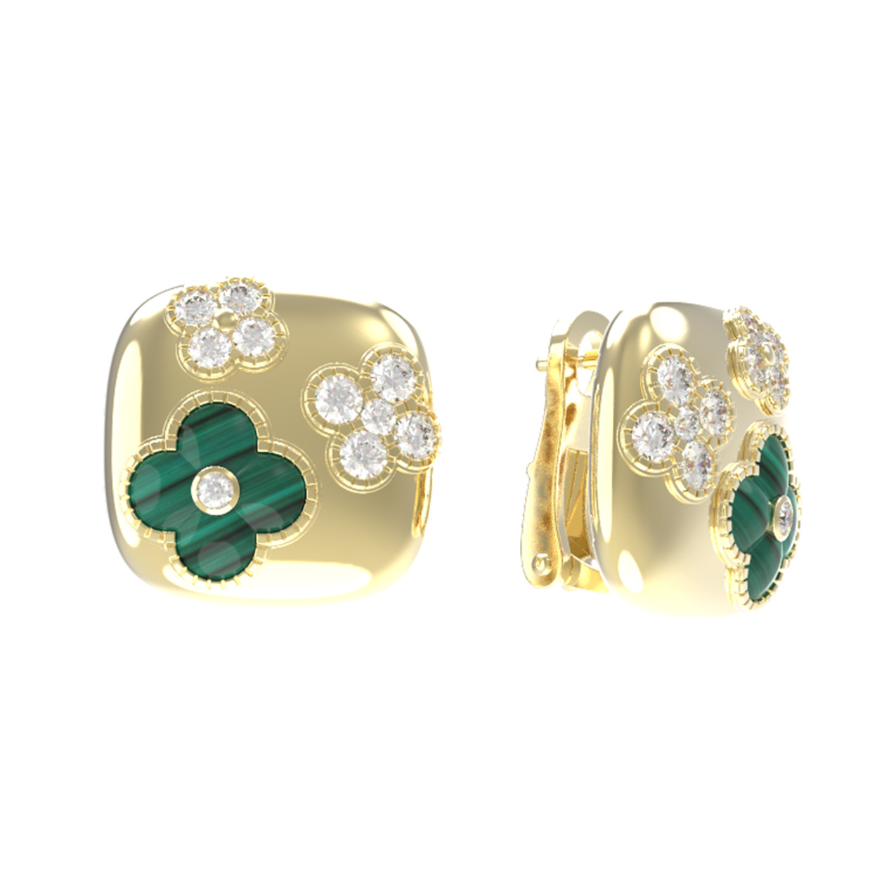 Эти серьги с малахитом и бриллиантами являются важным элементом коллекции De Luxe — Цветок Флоренции. Изделие самодостаточно, но при желании может стать частью эффектного комплекта, дополняя другие украшения в аналогичном стиле. Выбирая данные серьги из лимонного золота, вы отдаете предпочтение мастерству исполнения и благородным материалам, которые сохранят свою эстетическую привлекательность на долгие годы. Гармоничное сочетание круглой формы и линий четырёхлистника делает модель универсальным выбором для ценителей ювелирного искусства.