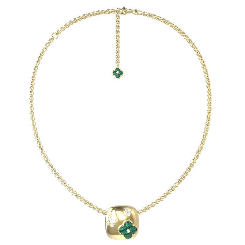 Центральная часть колье украшена вставками из благородного малахита глубокого зеленого цвета и сверкающими бриллиантами белого оттенка. Всего в композиции использовано 13 вставок круглой формы, которые придают украшению особое сияние и визуальный объем. Изящное плетение цепочки подчеркивает красоту подвески, создавая завершенный и лаконичный образ. Цветочный мотив, лежащий в основе дизайна, привносит в изделие легкость и весеннее настроение.
