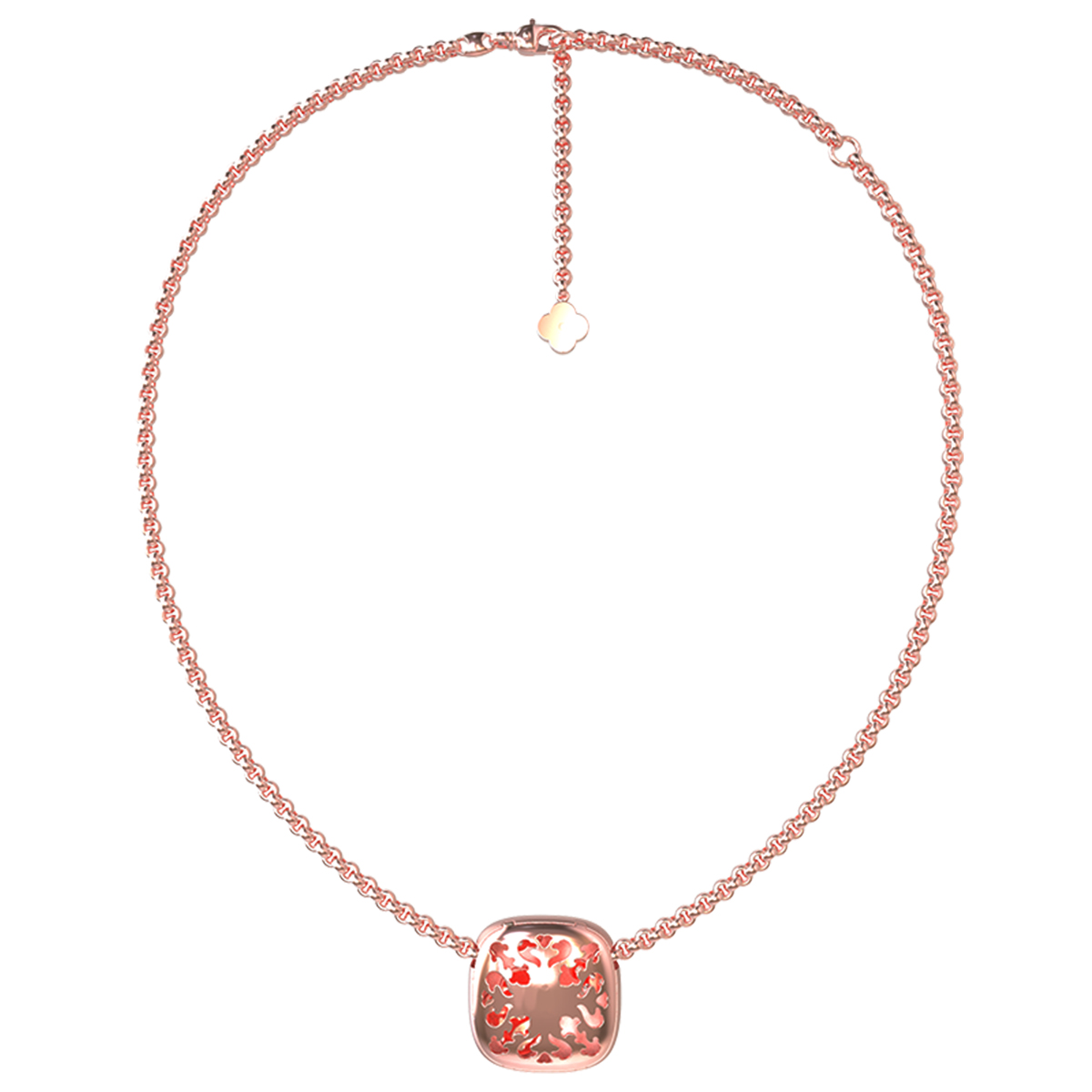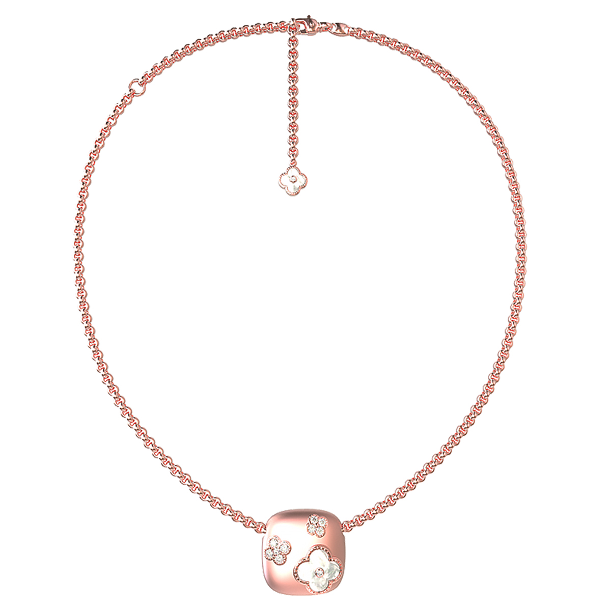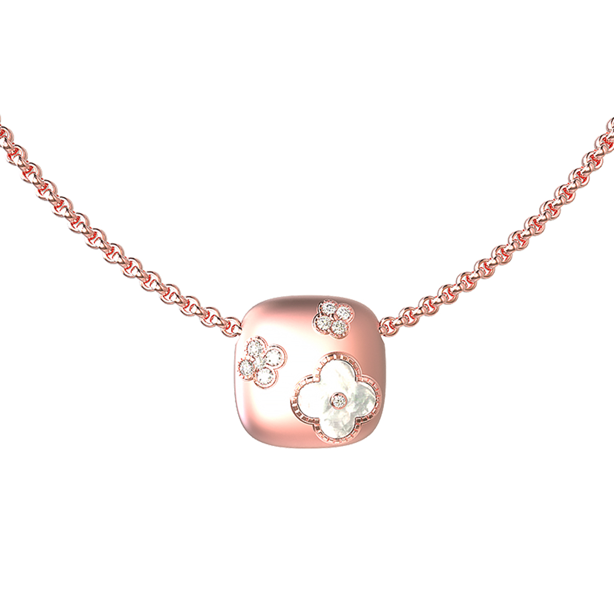 Ювелирное украшение декорировано 11 вставками. Нежное сияние белого перламутра гармонично сочетается с блеском драгоценных бриллиантов. Особую выразительность композиции придают детали в форме четырехлистника и круглых элементов, которые создают неповторимый цветочный дизайн. Розовый цвет золота подчеркивает мягкое мерцание вставок перламутрового оттенка.