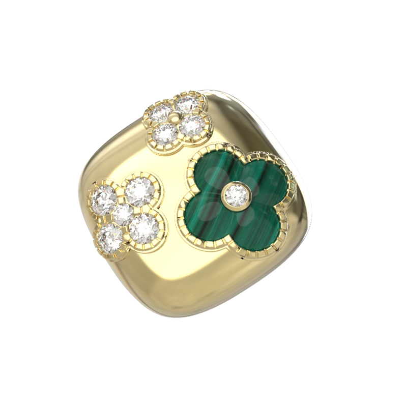 Главным акцентом композиции является мастерское сочетание материалов. Глубокий зеленый цвет малахита с его неповторимым природным рисунком создает элегантный контраст с ослепительным блеском белых бриллиантов. Вставки имеют две формы — классический круг и изысканный четырехлистник, которые в совокупности образуют цветочную композицию. Всего в изделии использовано 11 вставок, каждая из которых надежно закреплена и подчеркивает премиальный статус украшения.