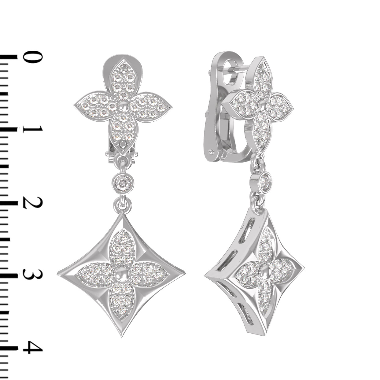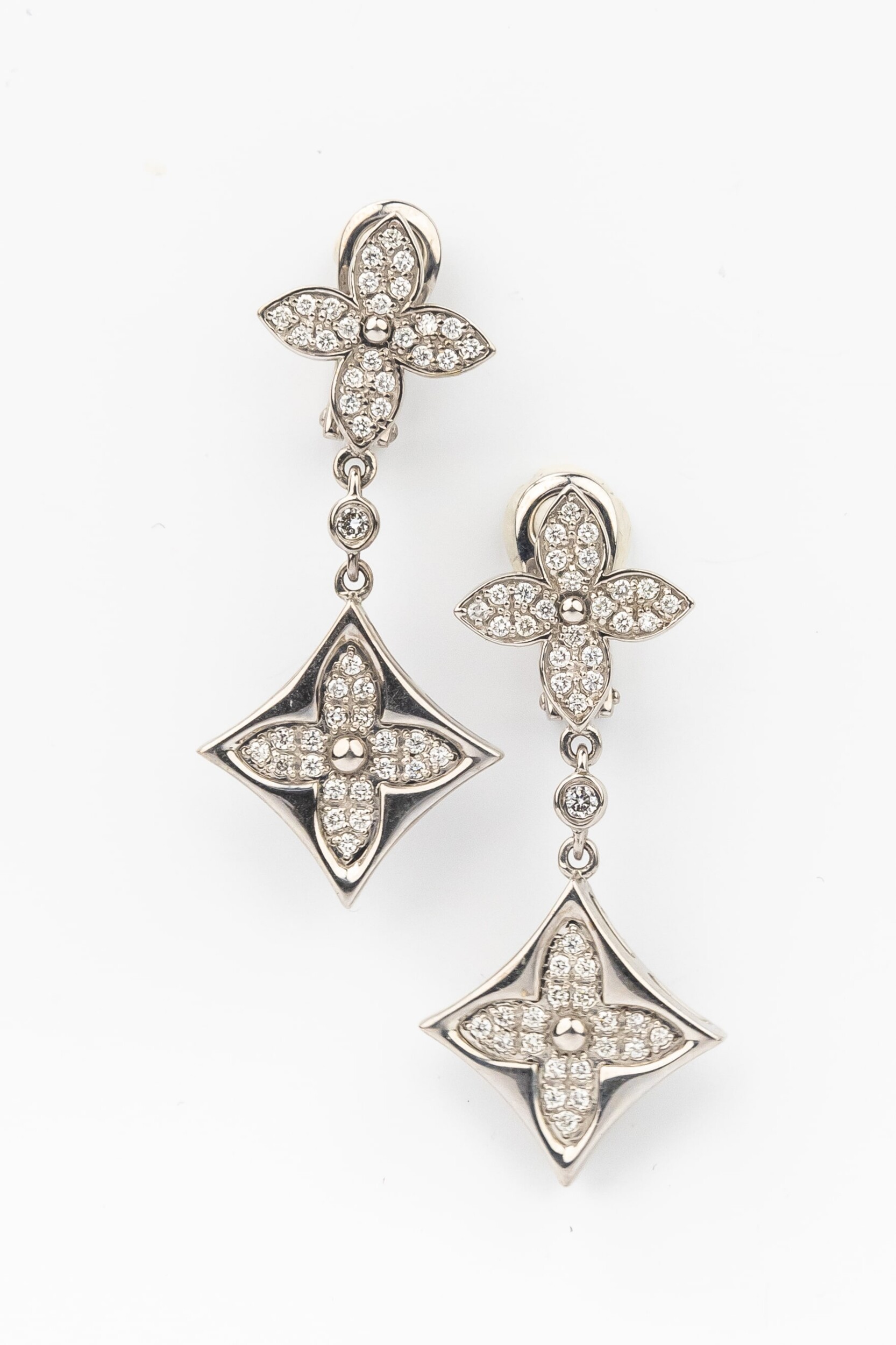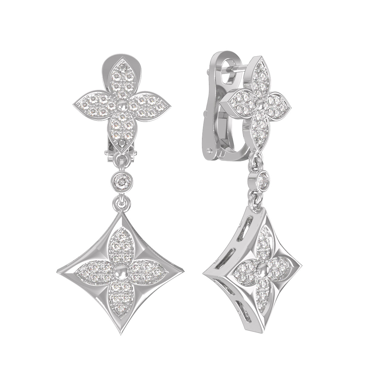 Композиция серег построена на сиянии драгоценных камней: изделие инкрустировано 90 бриллиантами круглой огранки с чистым белым цветом вставок. Холодный блеск белого золота в сочетании с переливами камней создает завораживающий визуальный эффект. Продуманная архитектура серег обеспечивает комфортную посадку, подчеркивая выразительность линий лица.