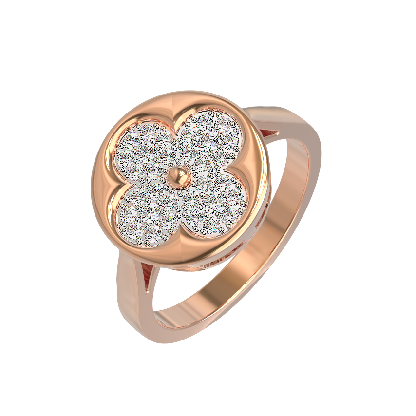 Изысканное кольцо из красного золота 585 пробы станет утонченным дополнением вашего образа. Дизайн украшения, выполненный в форме нежного цветка клевера, подчеркивает безупречный вкус владельца и придает изделию особый шарм. Центральный элемент инкрустирован 32 бриллиантами круглой огранки, которые завораживают своим сиянием и чистотой белого цвета вставок.