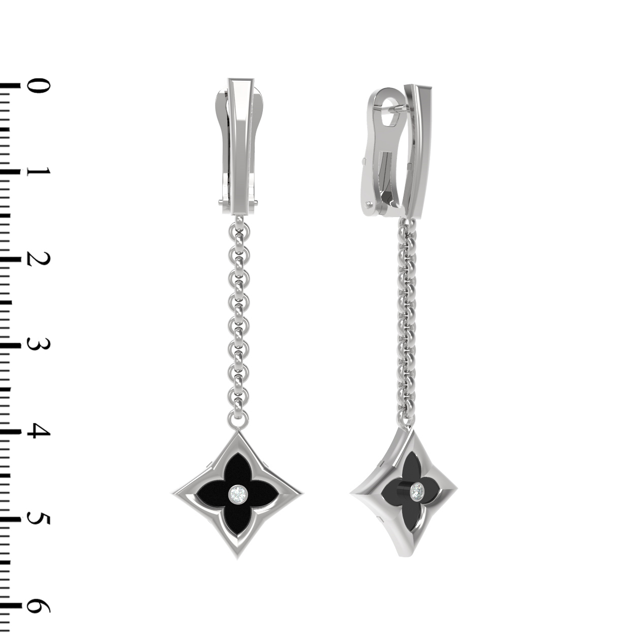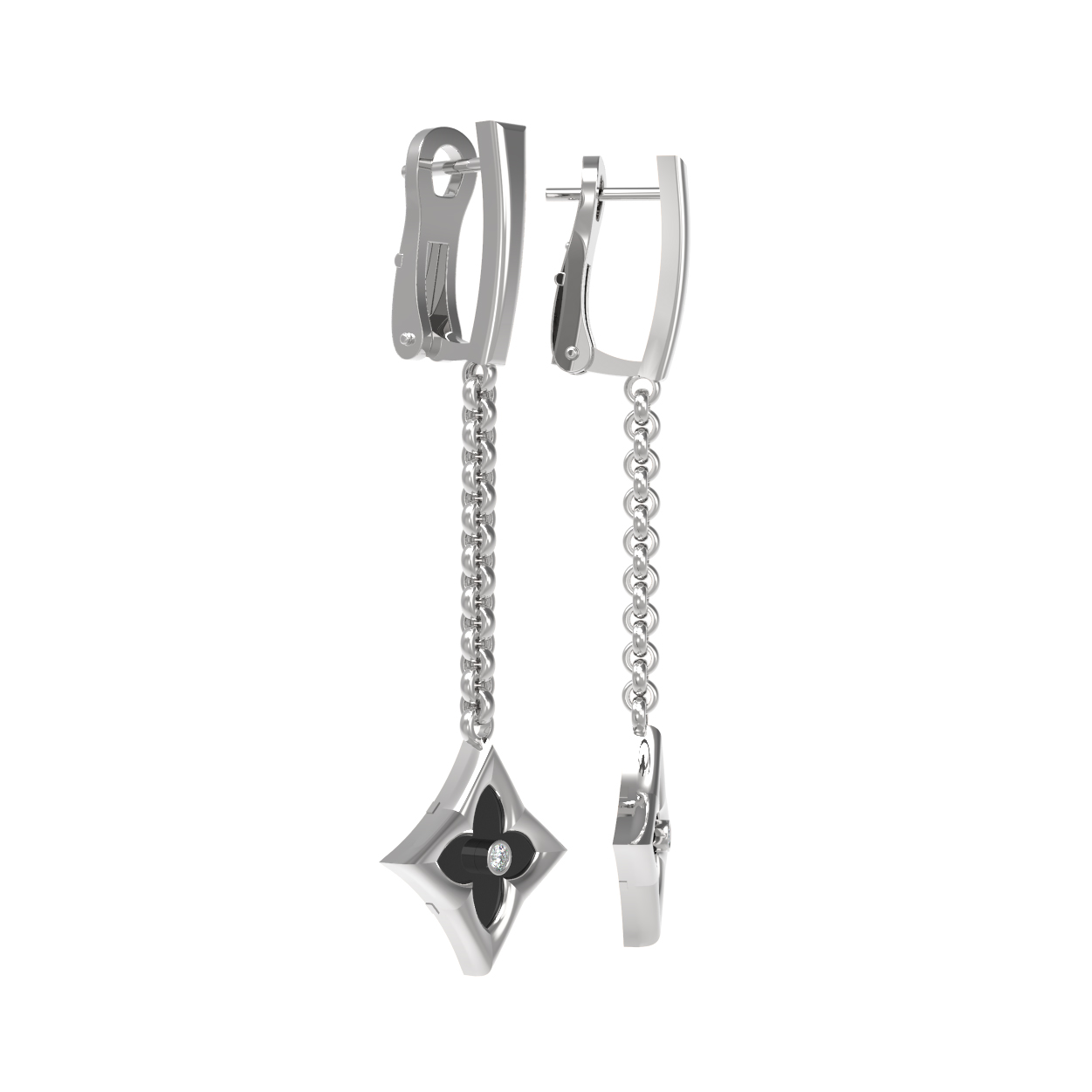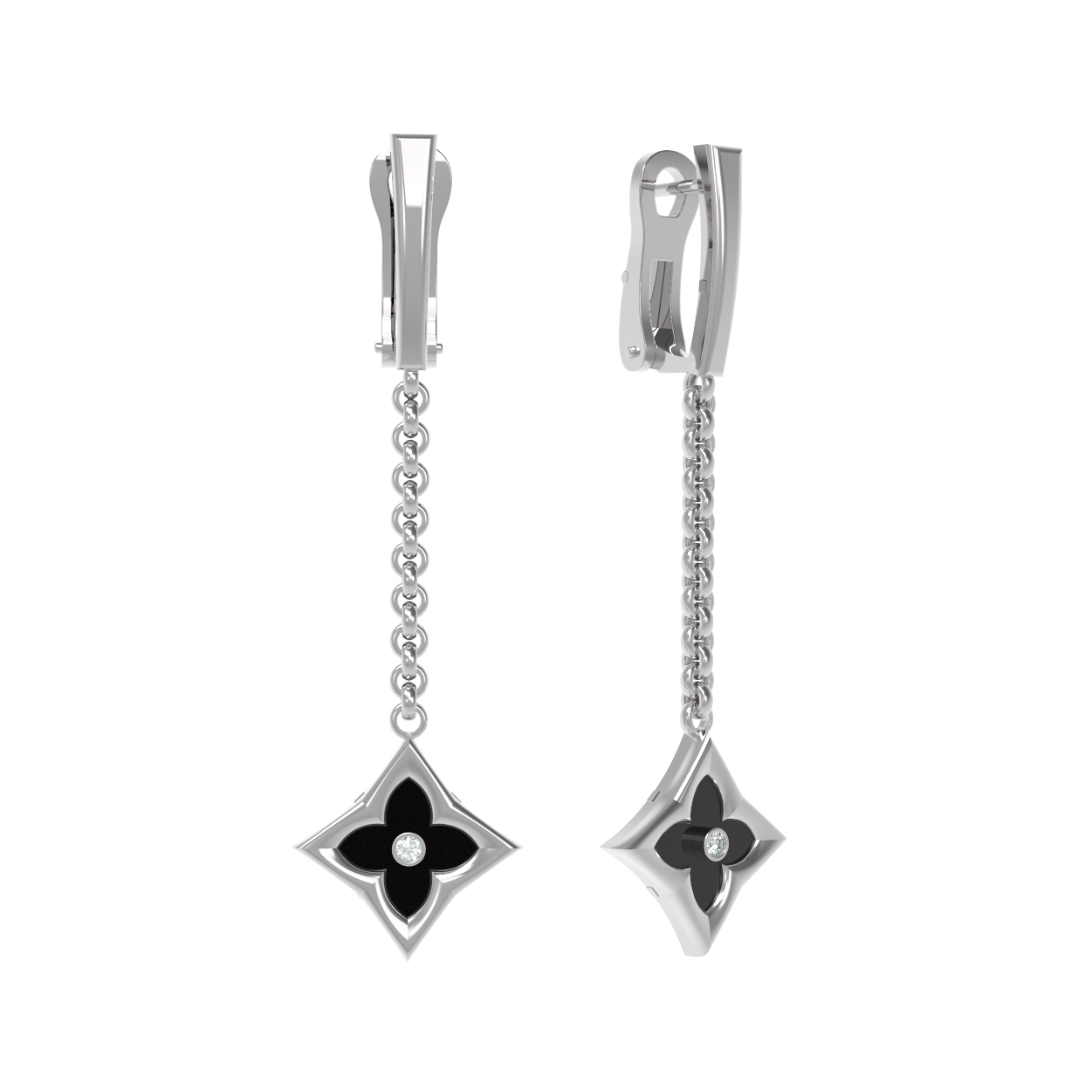 Особую выразительность серьгам придает эффектное сочетание вставок: глубокий черный оникс гармонично дополнен сверкающим белым бриллиантом. В общей сложности в изделии использовано 4 вставки круглой формы, которые создают игру света и тени, подчеркивая премиальный статус украшения. Благодаря сочетанию классического белого золота и благородных камней, эти серьги станут идеальным завершением как делового, так и вечернего образа.
