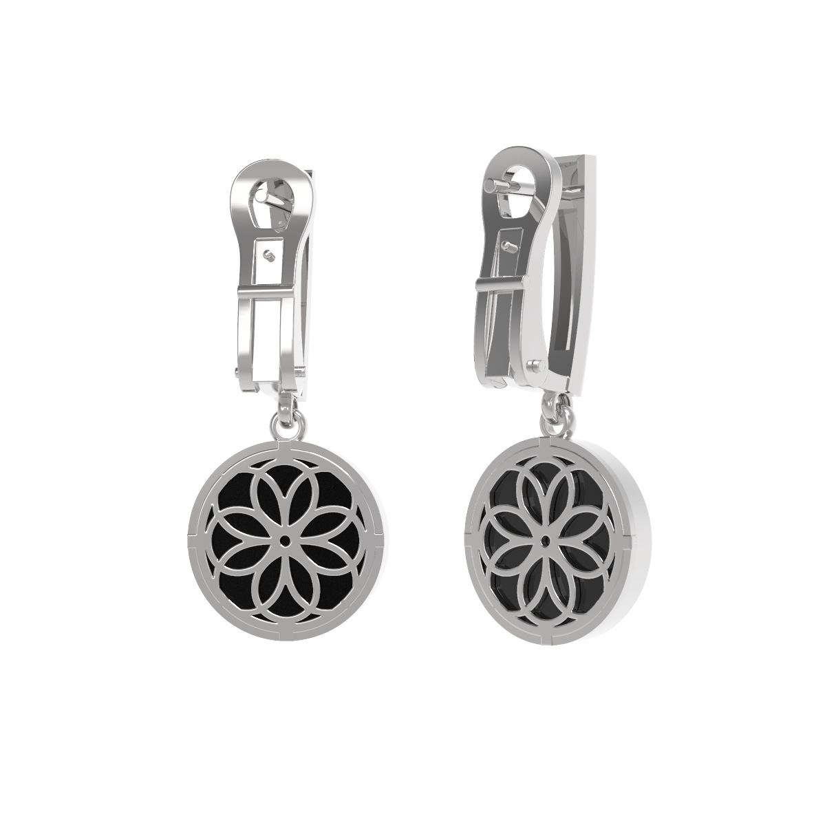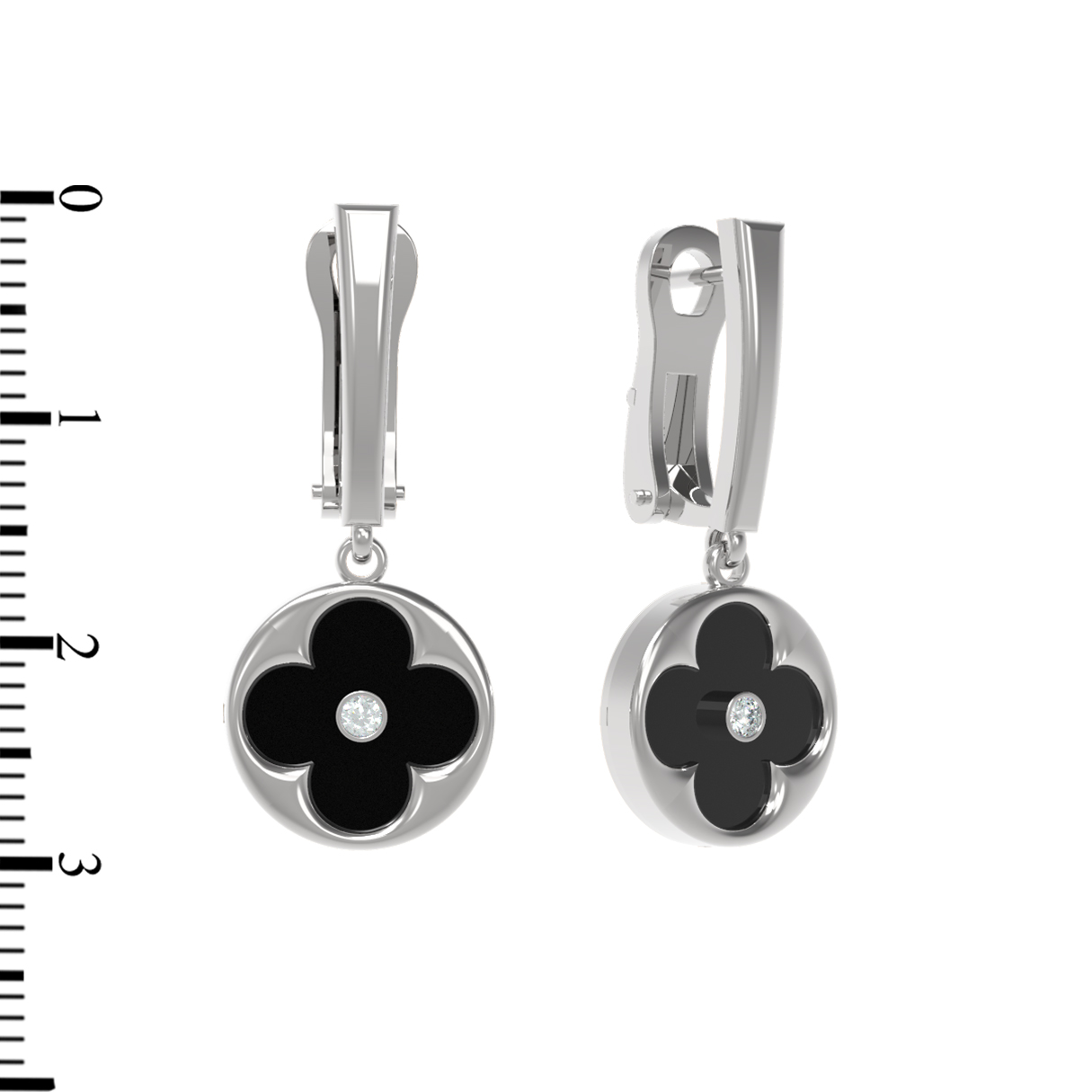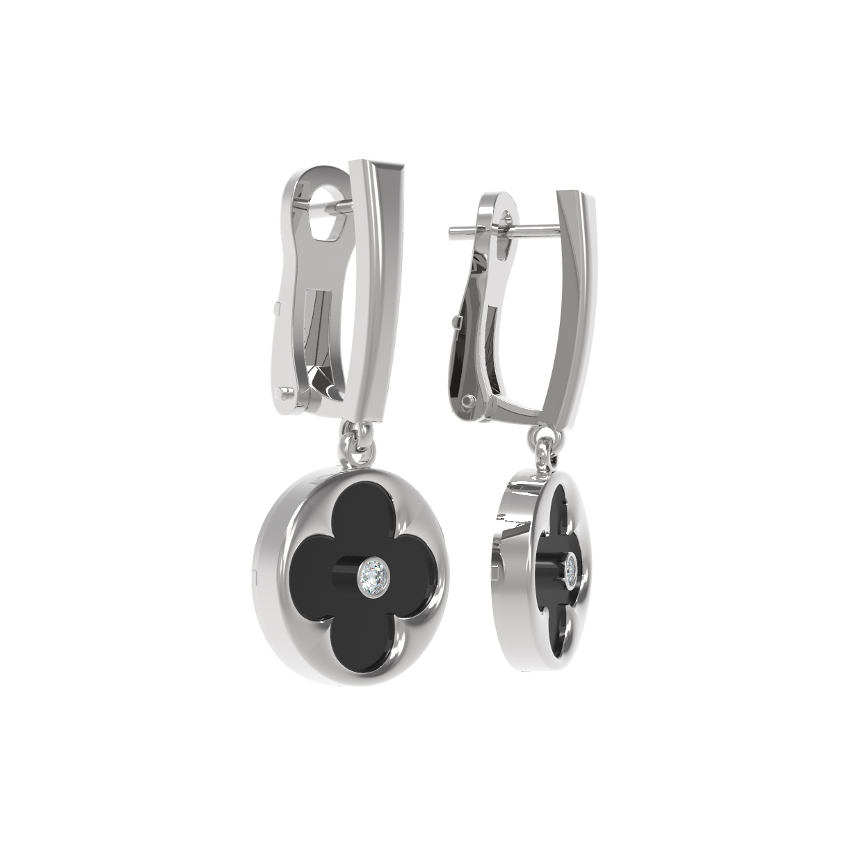 Центральная часть каждой серьги украшена круглым бриллиантом, который придает изделию особое сияние при каждом движении. Всего в комплекте использованы четыре вставки, гармонично дополняющие композицию. Благодаря универсальному дизайну и цветовой палитре — белый металл в сочетании с белыми и черными вставками — эти серьги являются гармоничным дополнением как для женского, так и для мужского образа. Изделие прекрасно смотрится как самостоятельный аксессуар, так и в составе комплектов, позволяя создавать продуманные и целостные ювелирные ансамбли для особых случаев или повседневных выходов в свет.