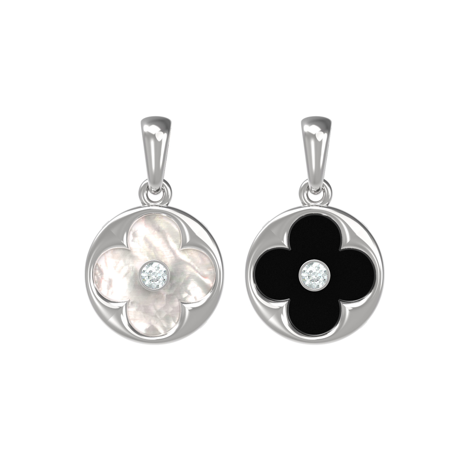 Особую выразительность подвеске придают контрастные вставки: благородный черный оникс и нежный переливающийся перламутр. Сочетание белого золота с черными и белыми акцентами создает эффектный визуальный образ, который подчеркивает статус и безупречный вкус владельца. Ювелирное украшение подходит как для женщин, так и для мужчин, являясь универсальным дополнением к повседневному или вечернему гардеробу.