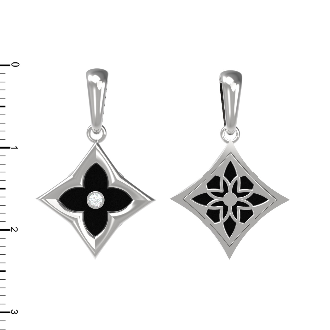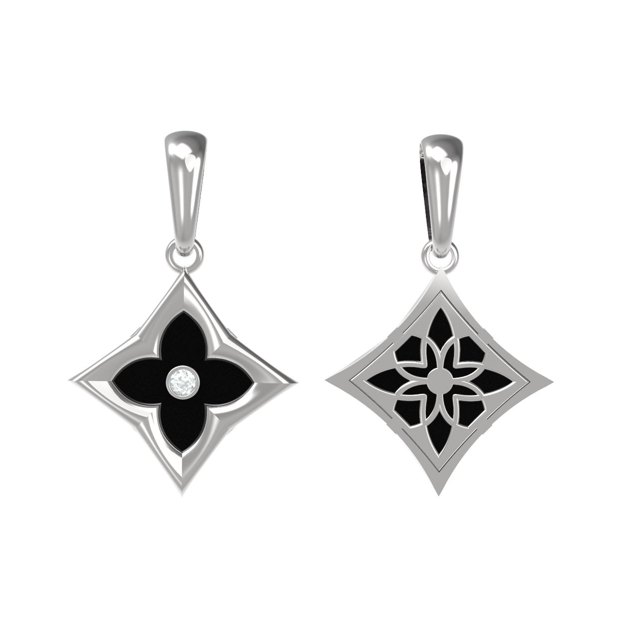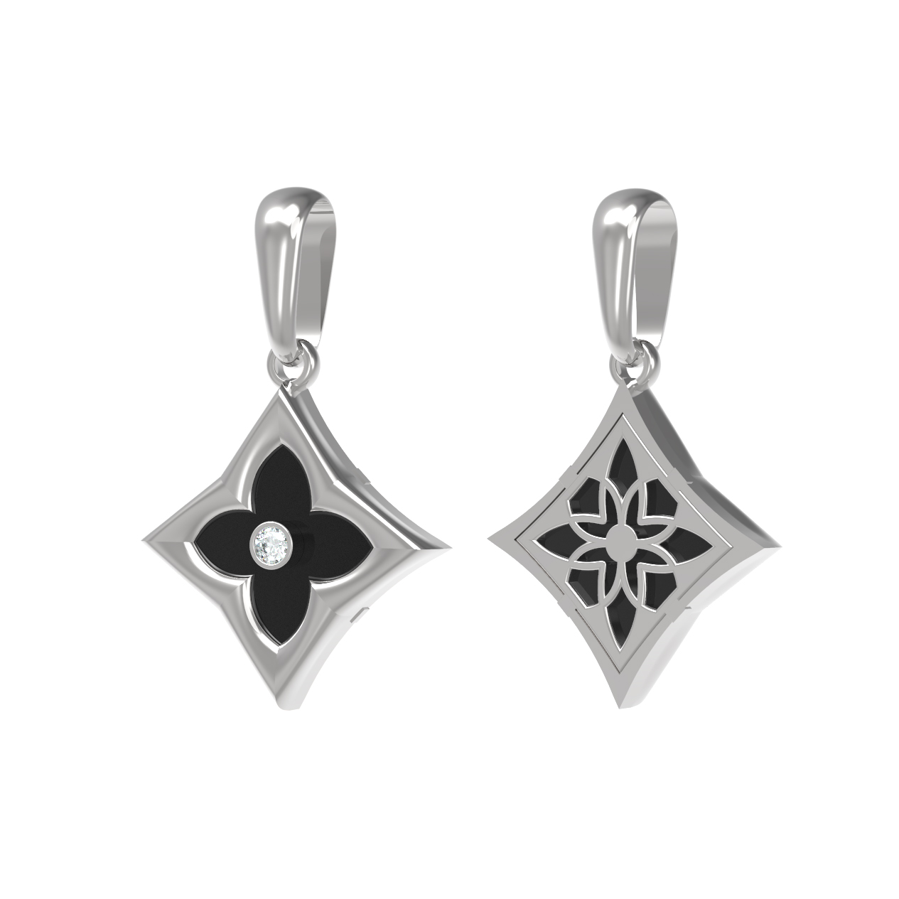 В этой модели использованы две вставки: круглый бриллиант, придающий украшению ослепительный блеск, и оникс, который добавляет композиции строгости и благородства. Геометрические линии и продуманная форма вставок подчеркивают мастерство исполнения. Благодаря универсальной эстетике, это украшение подойдет как для женщин, так и для мужчин, желающих подчеркнуть свою индивидуальность стильным аксессуаром.