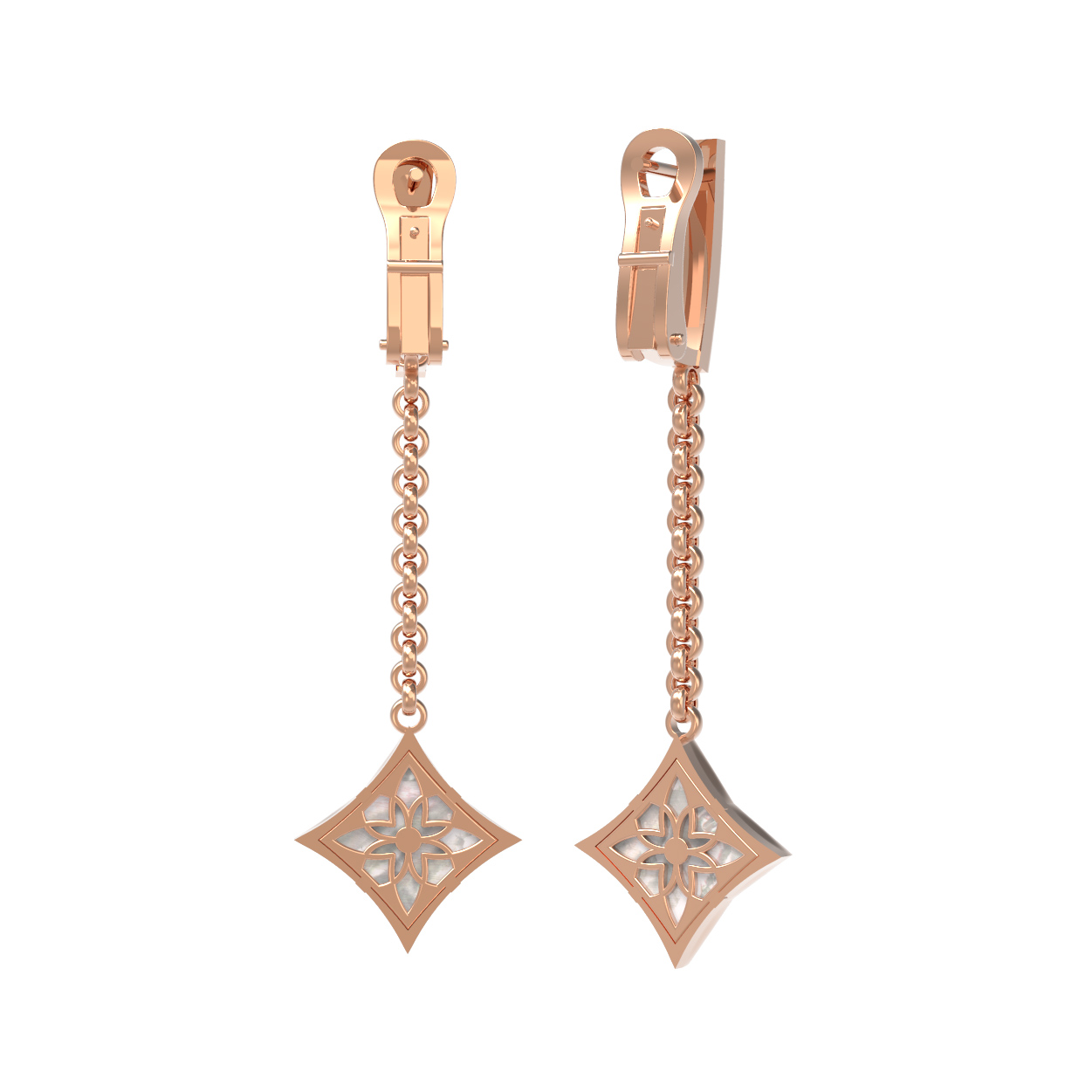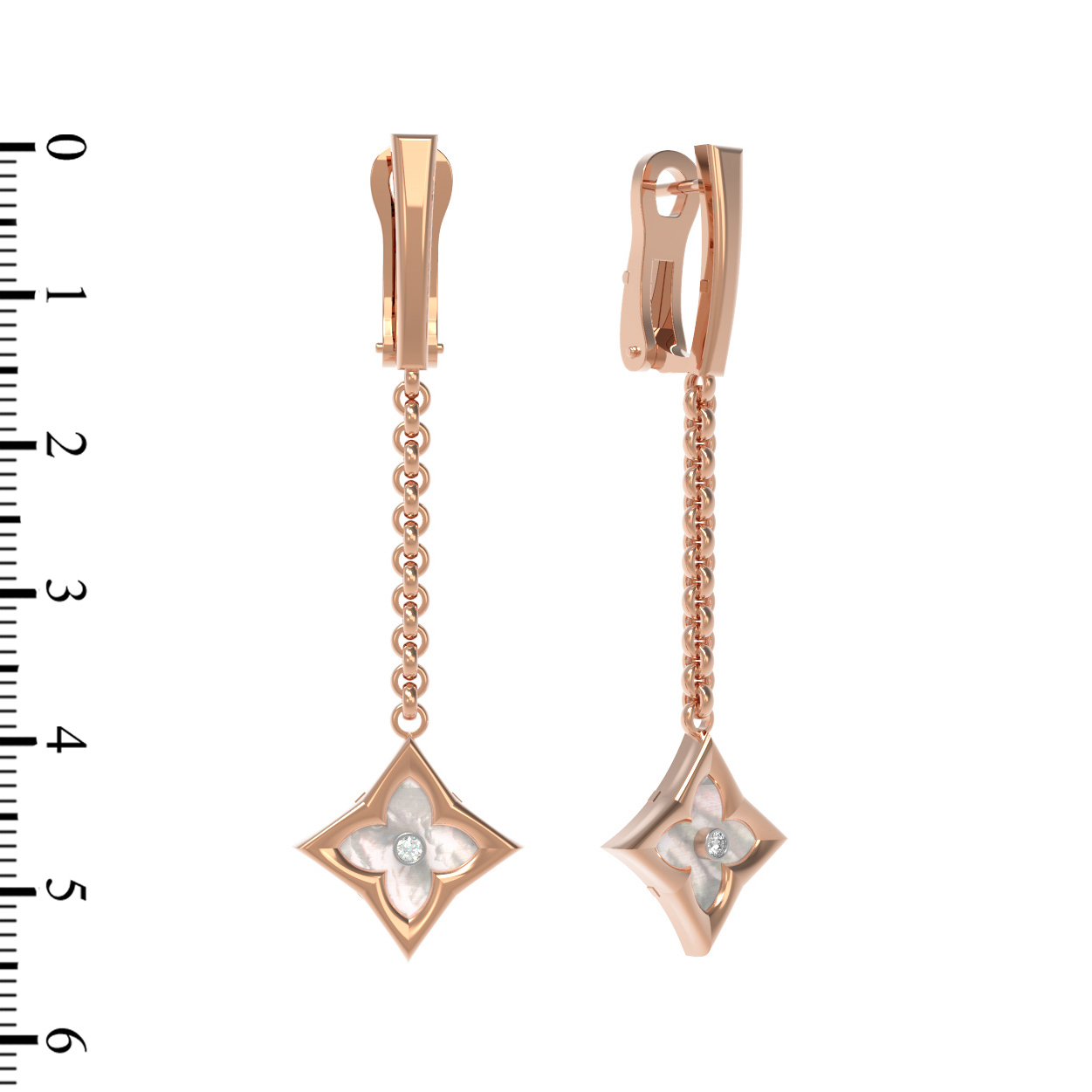 В центре композиции расположены вставки из нежного перламутра белого цвета, чей мягкий перелив гармонично сочетается с теплым блеском красного золота. Ромбовидная форма элементов инкрустирована сияющими бриллиантами круглой огранки. Всего в изделии использовано 2 драгоценных камня, которые добавляют яркости и выразительности.