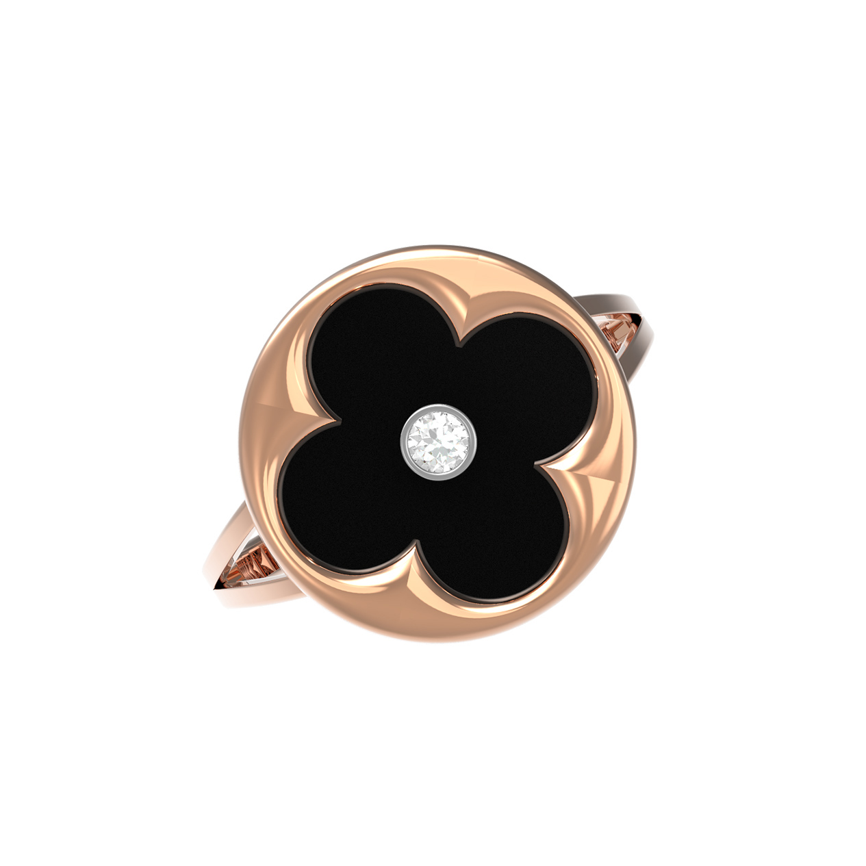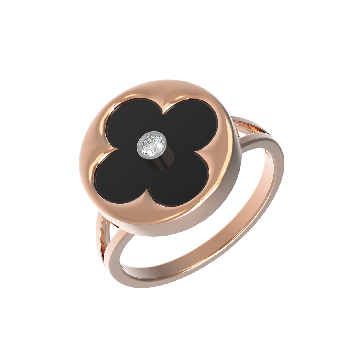Изысканное кольцо из красного золота 585 пробы — гармоничное сочетание классической роскоши и современного стиля. Дизайн украшения, выполненный в форме символичного клевера, притягивает взгляд своей элегантностью и лаконичностью линий. В центральной части композиции расположен глубокий черный оникс, который создает эффектный контраст с теплым сиянием золотой оправы. Венчает изделие чистый и яркий бриллиант круглой формы, добавляющий аксессуару благородного блеска.