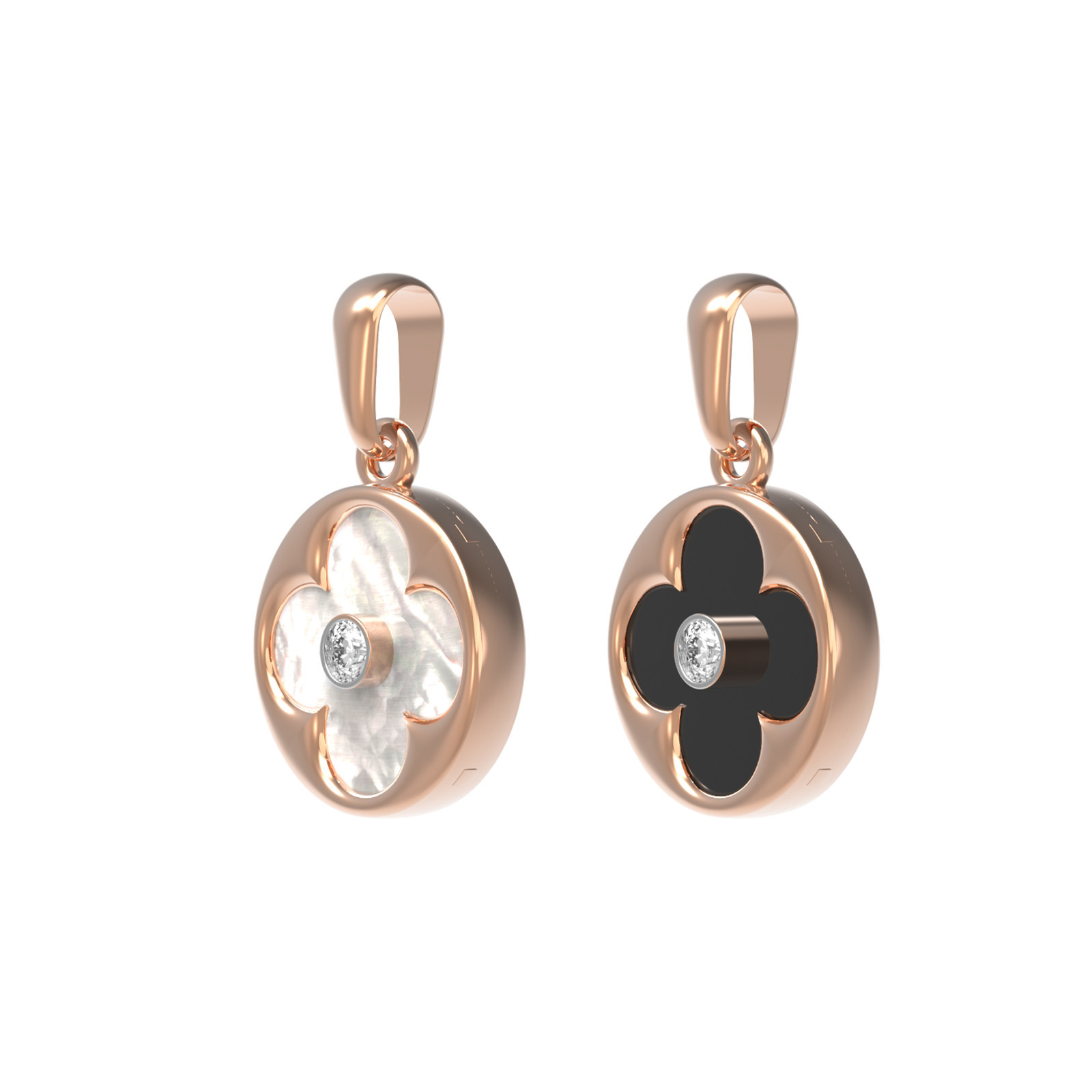 Подвеска из красного золота 585 пробы — изысканный аксессуар, который гармонично дополнит как женский, так и мужской образ. Данное украшение, представленное в коллекции De Luxe — Амальфи — Бриллианты, выполнено в утонченном дизайне в виде клевера, что придает изделию особое очарование и символический смысл. Мягкий блеск благородного металла подчеркивает глубину цветовой палитры вставок: здесь сочетаются классический белый бриллиант круглой формы, насыщенный черный оникс и нежный перламутр.