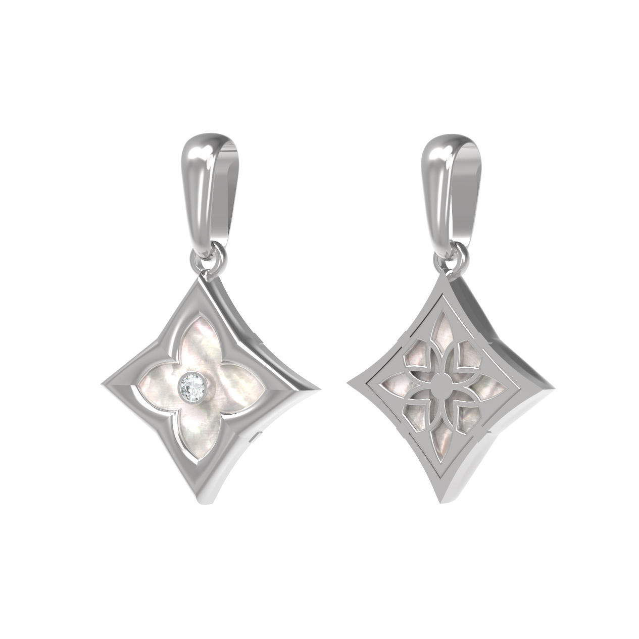 В центре композиции расположен сверкающий бриллиант круглой формы, который акцентирует внимание на глубине и чистоте инкрустации. Контрастный блеск драгоценного камня подчеркивается вставкой из нежного перламутра, имеющего правильную ромбовидную форму. Белый цвет вставок гармонично сочетается с холодным оттенком белого золота, создавая сбалансированный и притягательный визуальный эффект. Использование качественных материалов обеспечивает изделию долговечность и безупречный внешний вид при повседневном ношении.