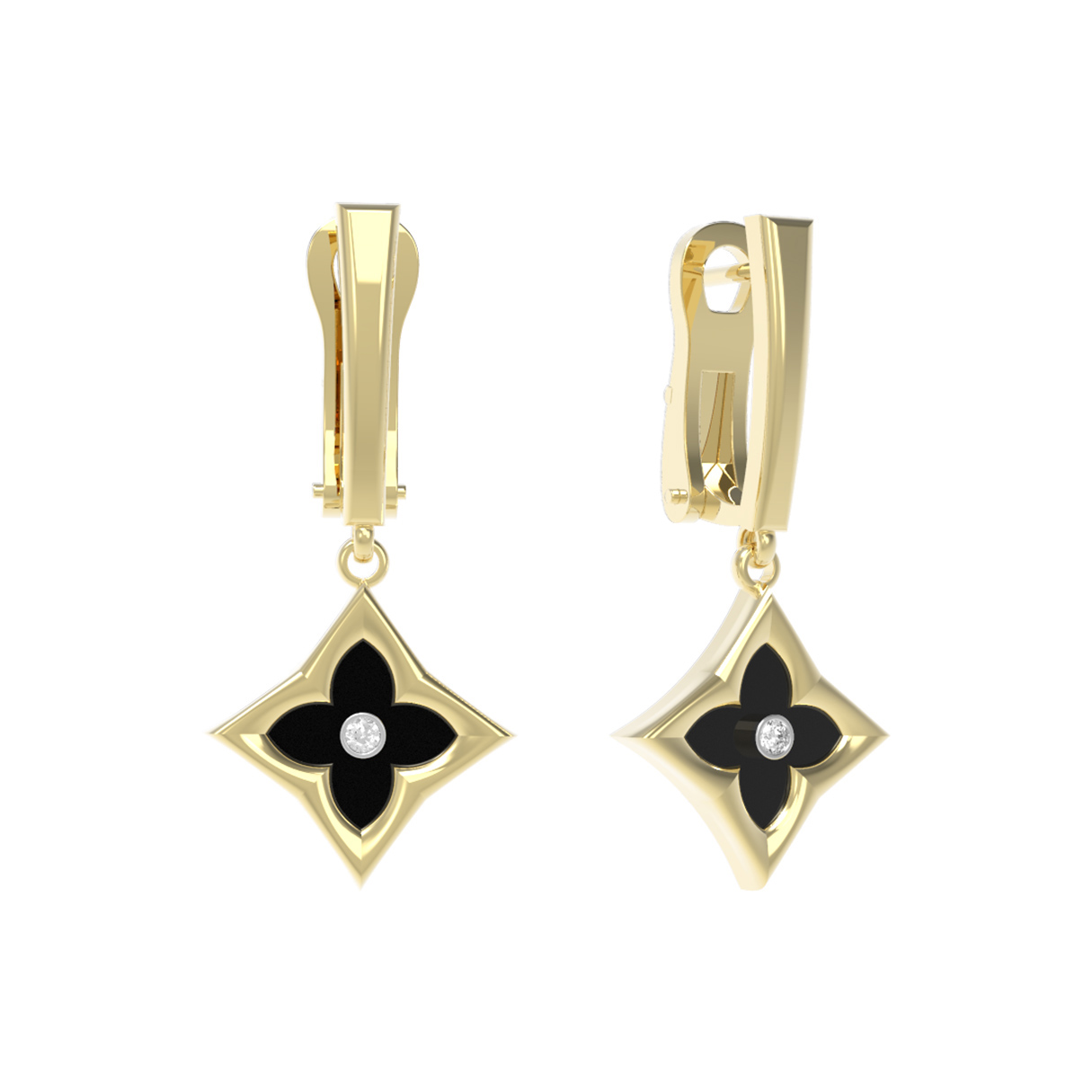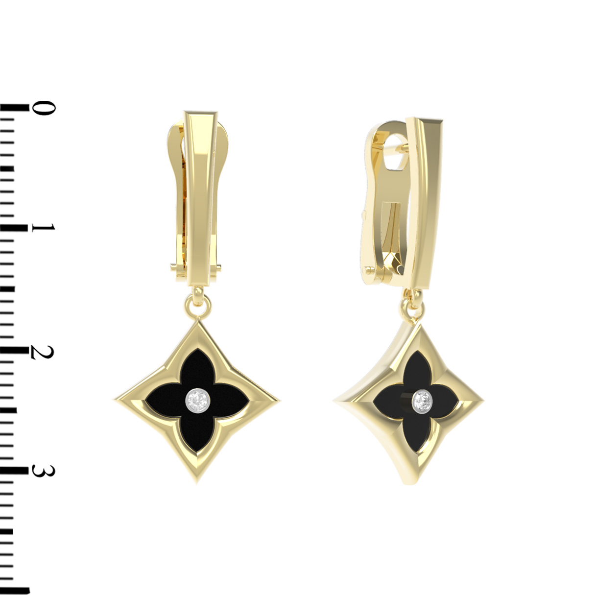 В центре каждого элемента расположен сияющий бриллиант круглой огранки, который эффектно контрастирует с глубоким черным цветом оникса ромбовидной формы. Всего в изделии использованы 4 вставки, создающие выразительную игру света и цвета. Контраст белых бриллиантов и черного оникса в обрамлении лимонного золота делает эти серьги центральным акцентом вашего образа.