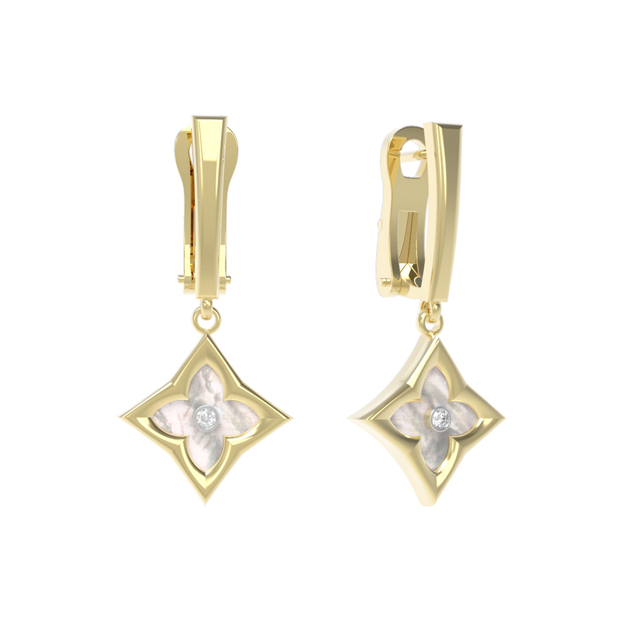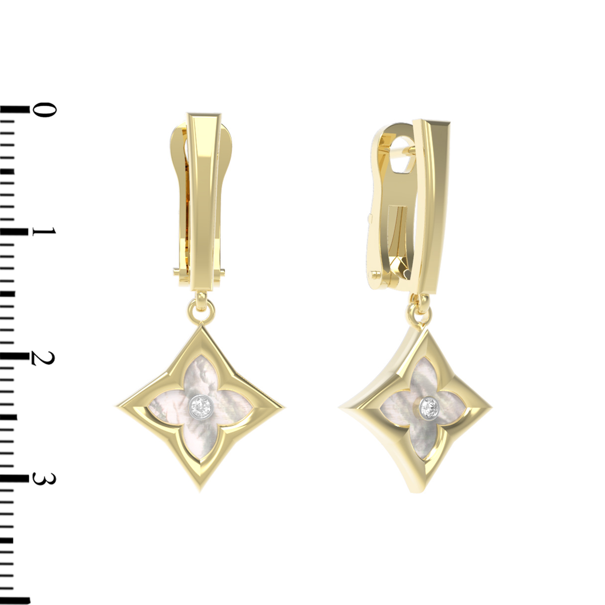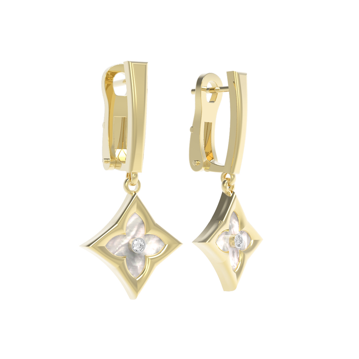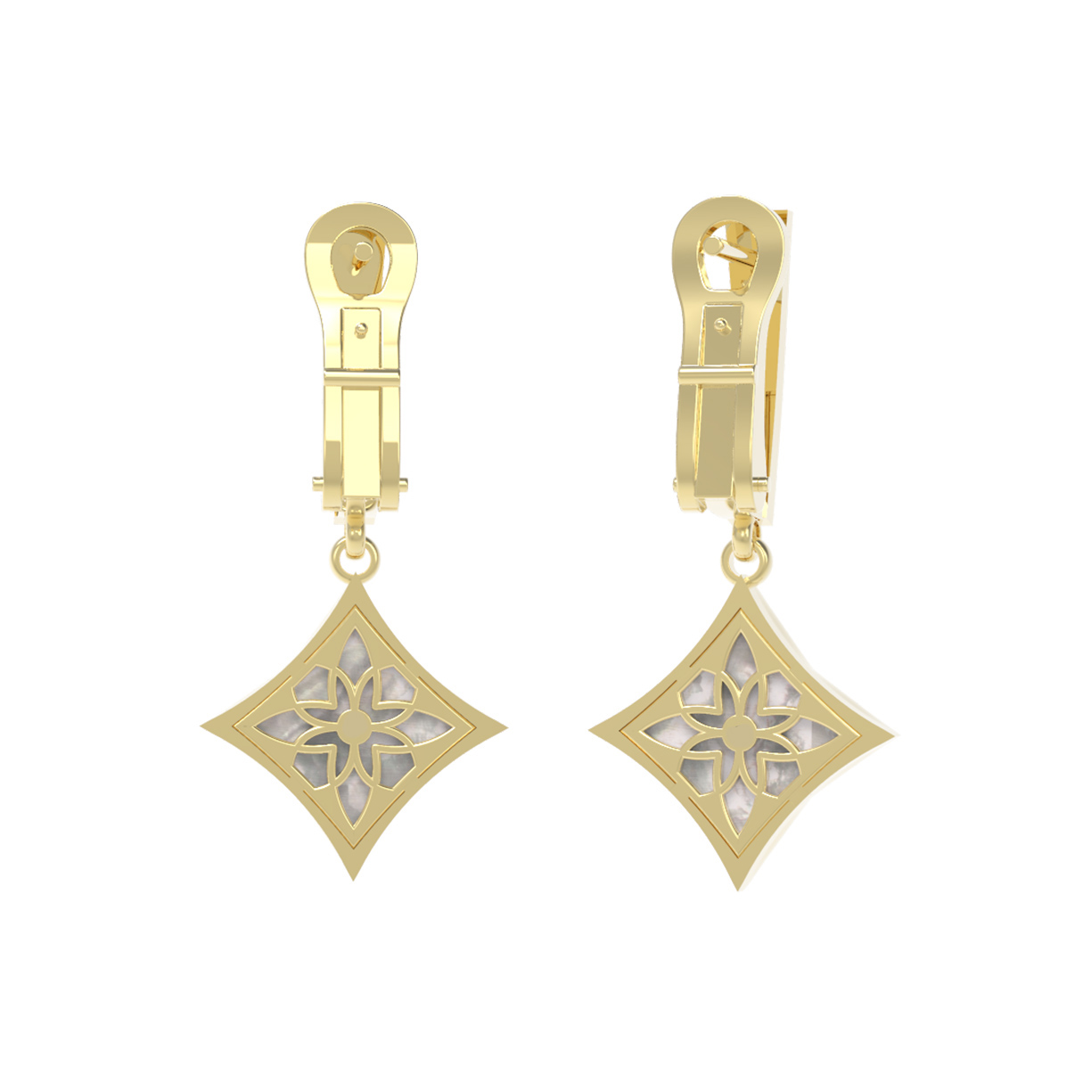 Центральным элементом композиции является перламутр, чьи мягкие переливы создают нежное сияние. В сердце каждого элемента расположен ослепительный бриллиант круглой огранки. Сочетание теплого оттенка лимонного золота и светлого блеска вставок подчеркивает статусность изделия. В украшении использовано 2 вставки: классический бриллиант и нежный перламутр, расположенные в элегантной оправе ромбовидной формы.