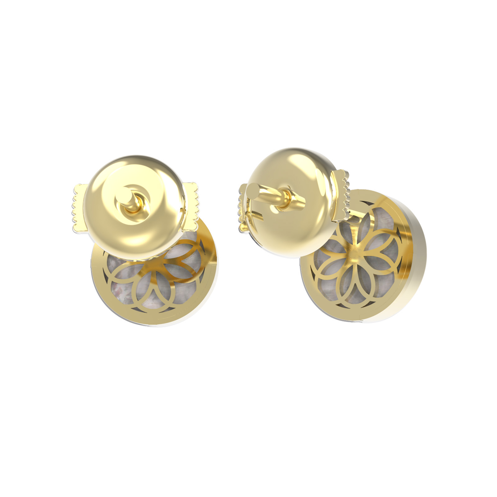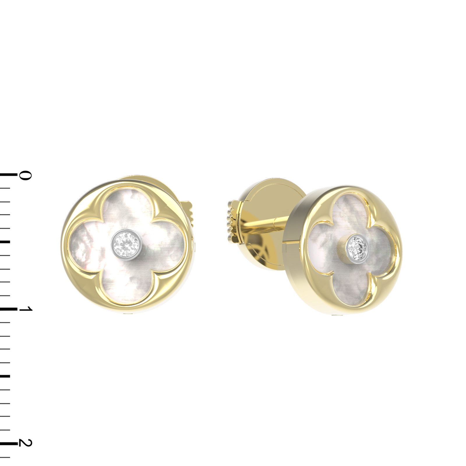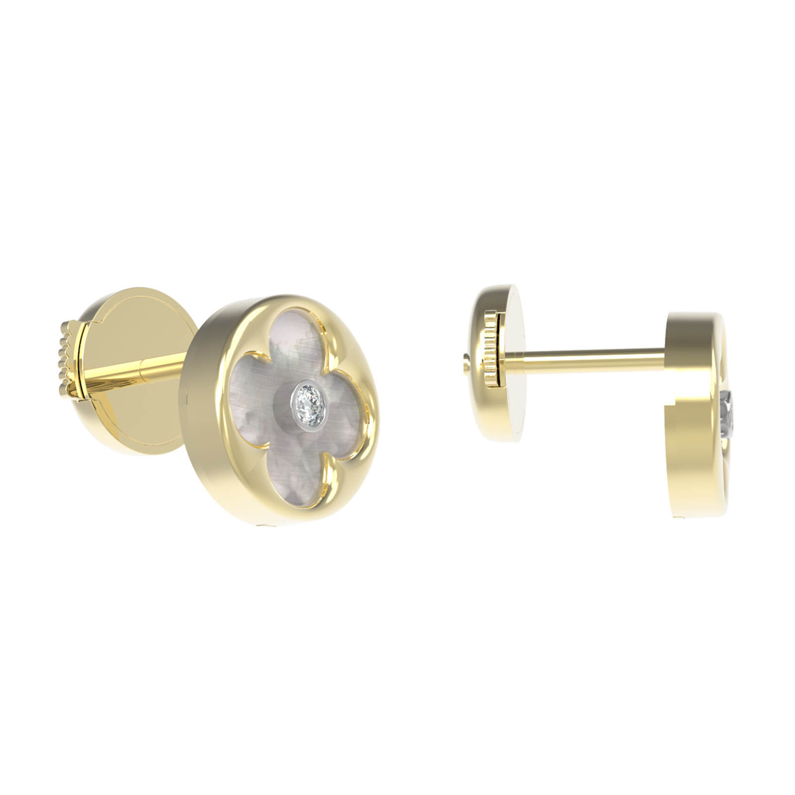 Центральным элементом композиции является вставка из нежного перламутра с мягким переливом, дополненная в центре сверкающим бриллиантом круглой огранки. Сочетание теплого оттенка лимонного золота, белого блеска драгоценного камня и перламутрового сияния создает невероятно эффектный контраст. В серьгах использовано две вставки, что придает изделию завершенность и баланс.