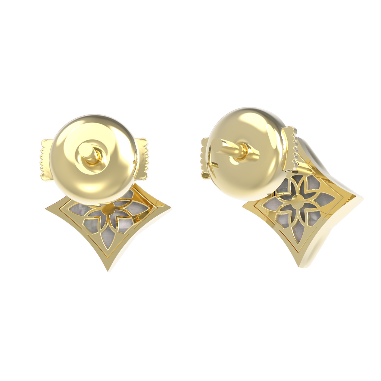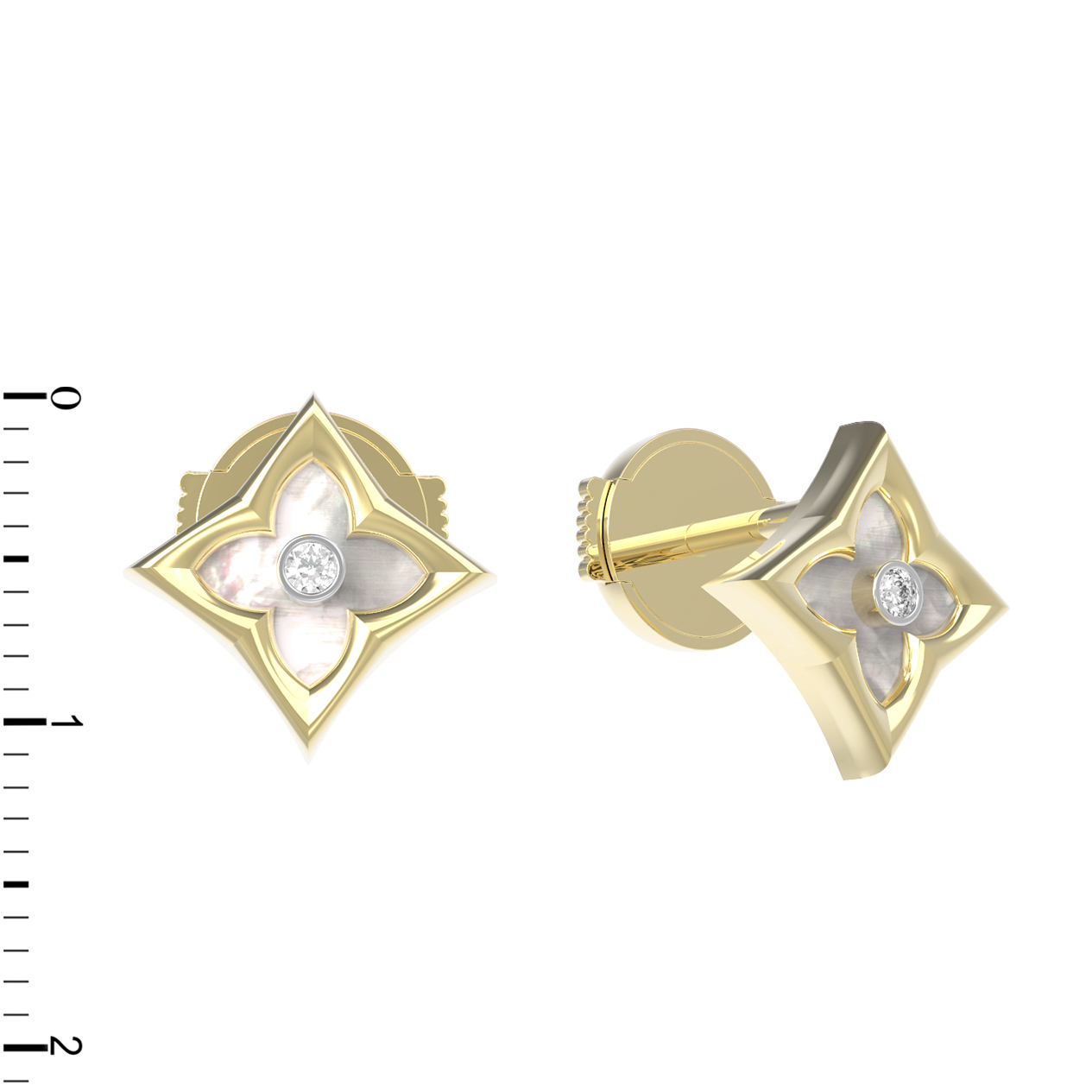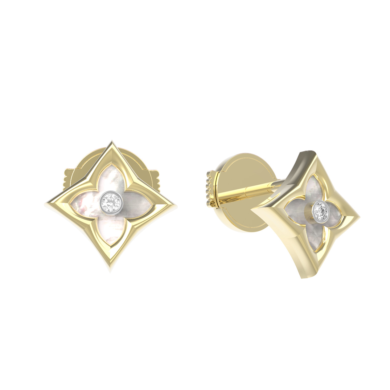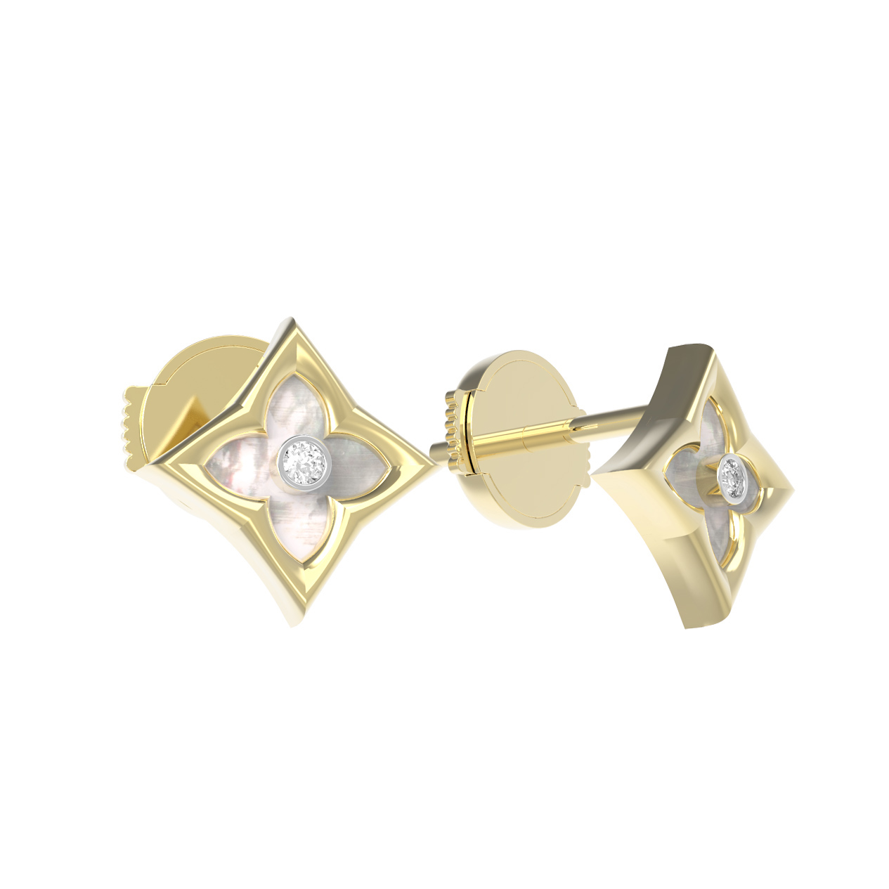 В центре композиции расположен сверкающий бриллиант круглой формы, дополненный нежным перламутром. Контраст благородного белого блеска вставок и теплого оттенка лимонного золота создает гармоничное сочетание, которое притягивает взгляд. В изделии использовано 2 вставки, которые деликатно переливаются при каждом движении.
